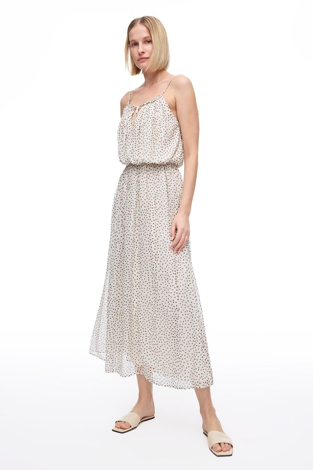 Kalıp : Regular Fit Kol : Sıfır Kol Model Boyu : Uzun Boy Dokuma-Örme : DOKUMA Cinsiyet : Kadın Üretim Yeri : Türkiye Desen : Puantiye Karışım : %100 Poliester Sezon : 2025 İLKBAHAR YAZ