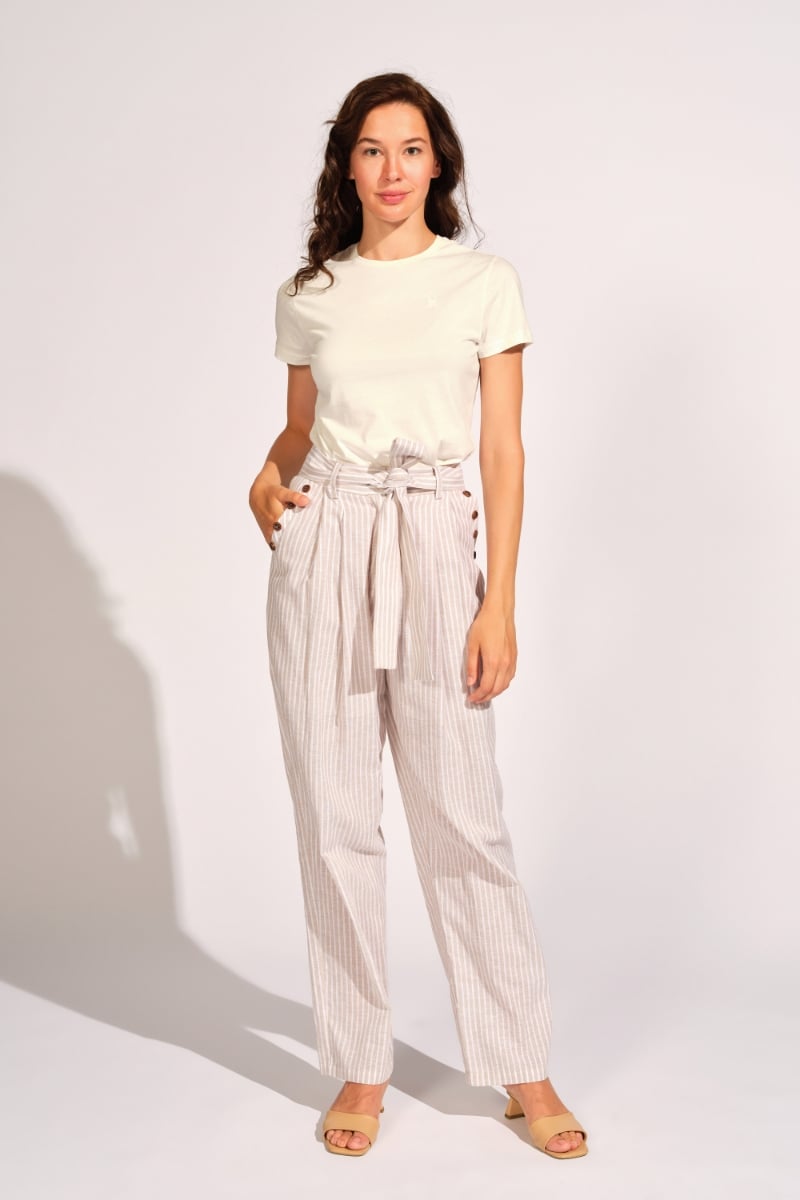 Beli kemerli, düğme detaylı keten pantolon.%50 Cotton %50 LinenBu ürünü 30 derecede, benzer renklerle, tersten yıkayınız ve gölgede kurutunuz. Baskı veya nakış olan bölgeye ütü temas ettirmeyiniz, bu bölge tersten ütülenebilir.