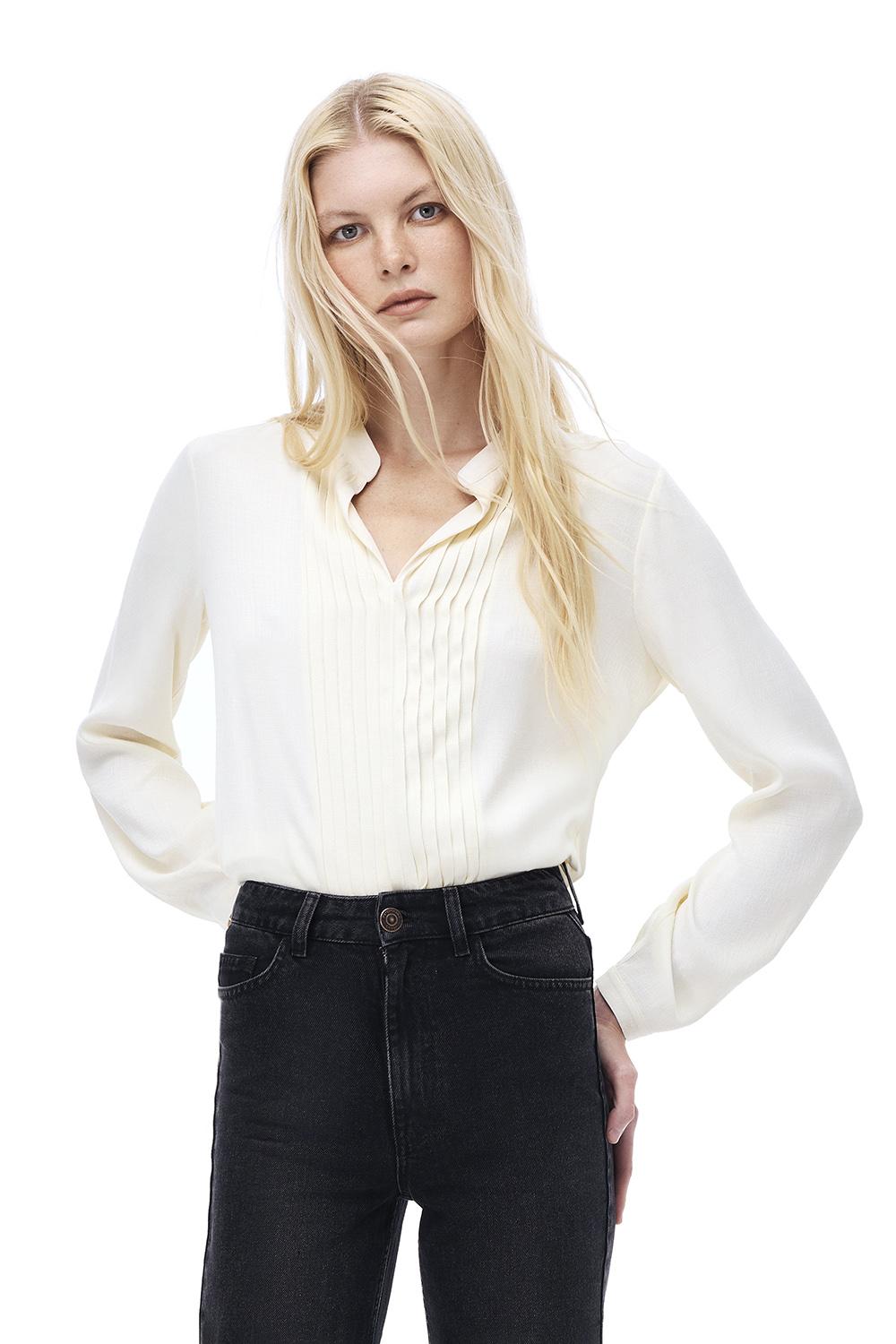 Akelas Regular Fit Standart Boy Takma Kol Hakim Yaka Bej Renk Kadın Bluz