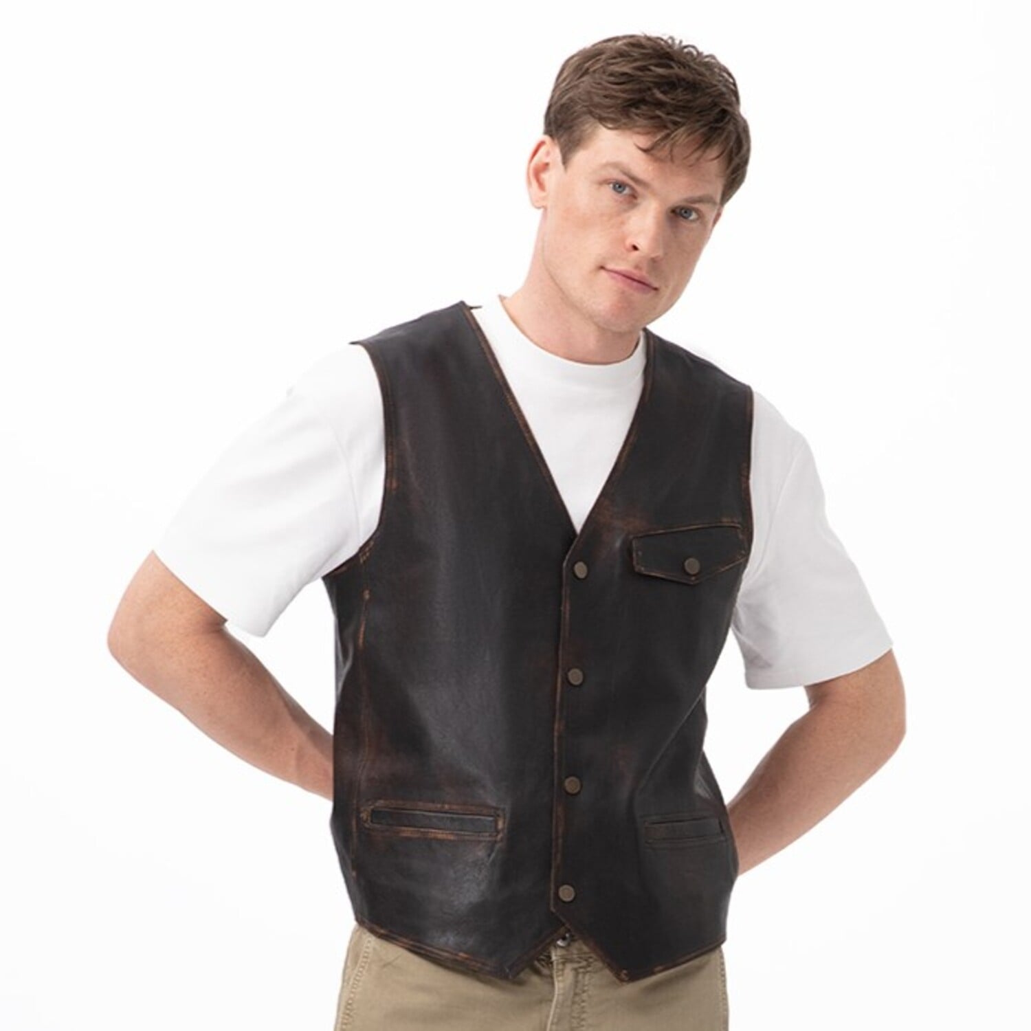 Erkek deri yelek. Önden metal çıtçıt kapamalıdır. Bir adet kapaklı göğüs cebi ve İki adet üstten girişli cebi mevcuttur. Günlük kullanım için uygundur. Ürün üzerine özel el işçiliği ile yapılan vintage ağartma efekt tekniği uygulanmıştır.