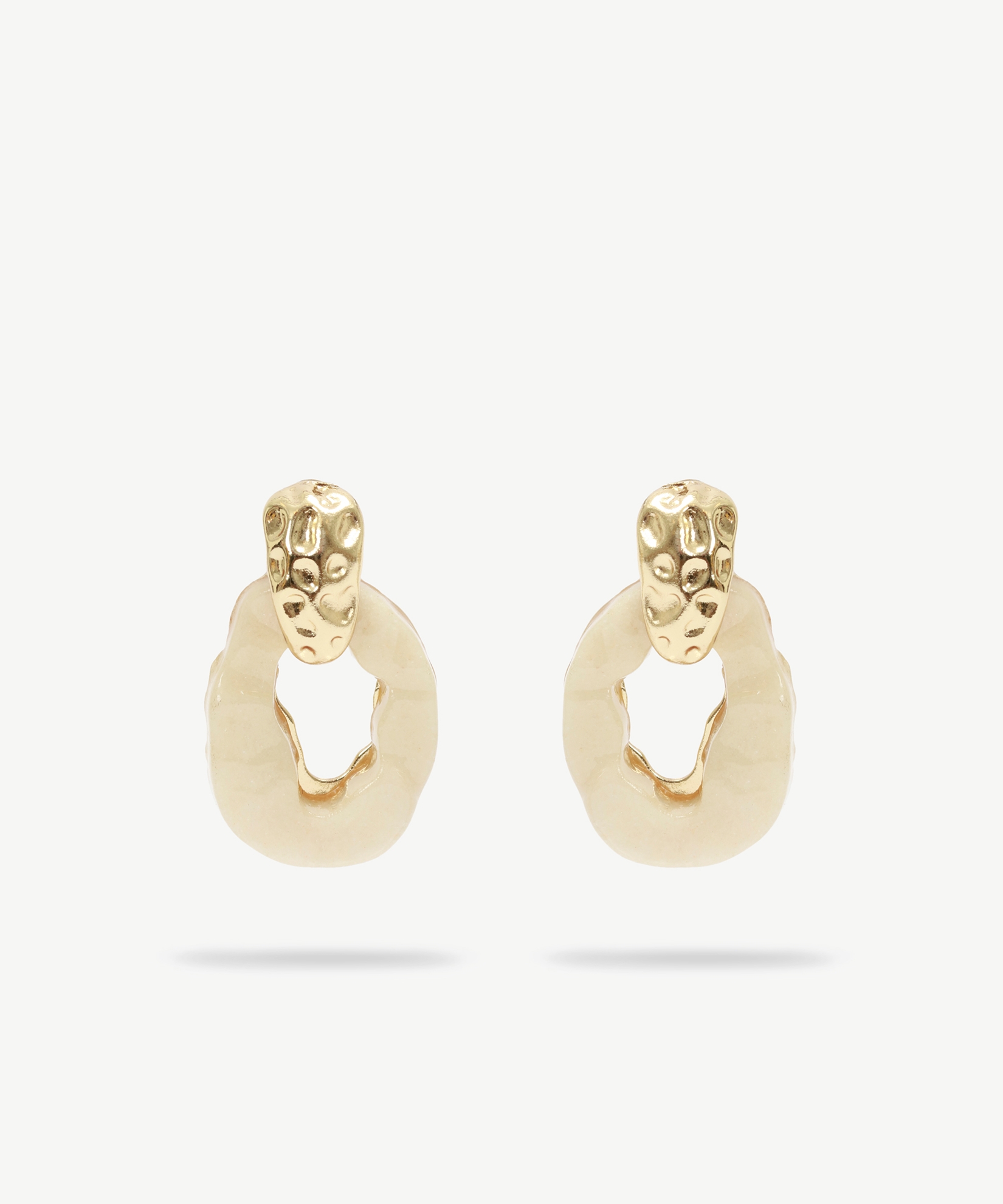 Materyal: recine | Ürün Ölçüleri: Doku detayları ve altın ışıltısıyla antik bir etki yaratan amorf formlu küpeler. Uzun ömürlü bir materyal olan reçineden üretilmiştir. Pek çok tarzla uyum gösterebilen çok yönlü modeliyle zamansız bir tasarımdır.