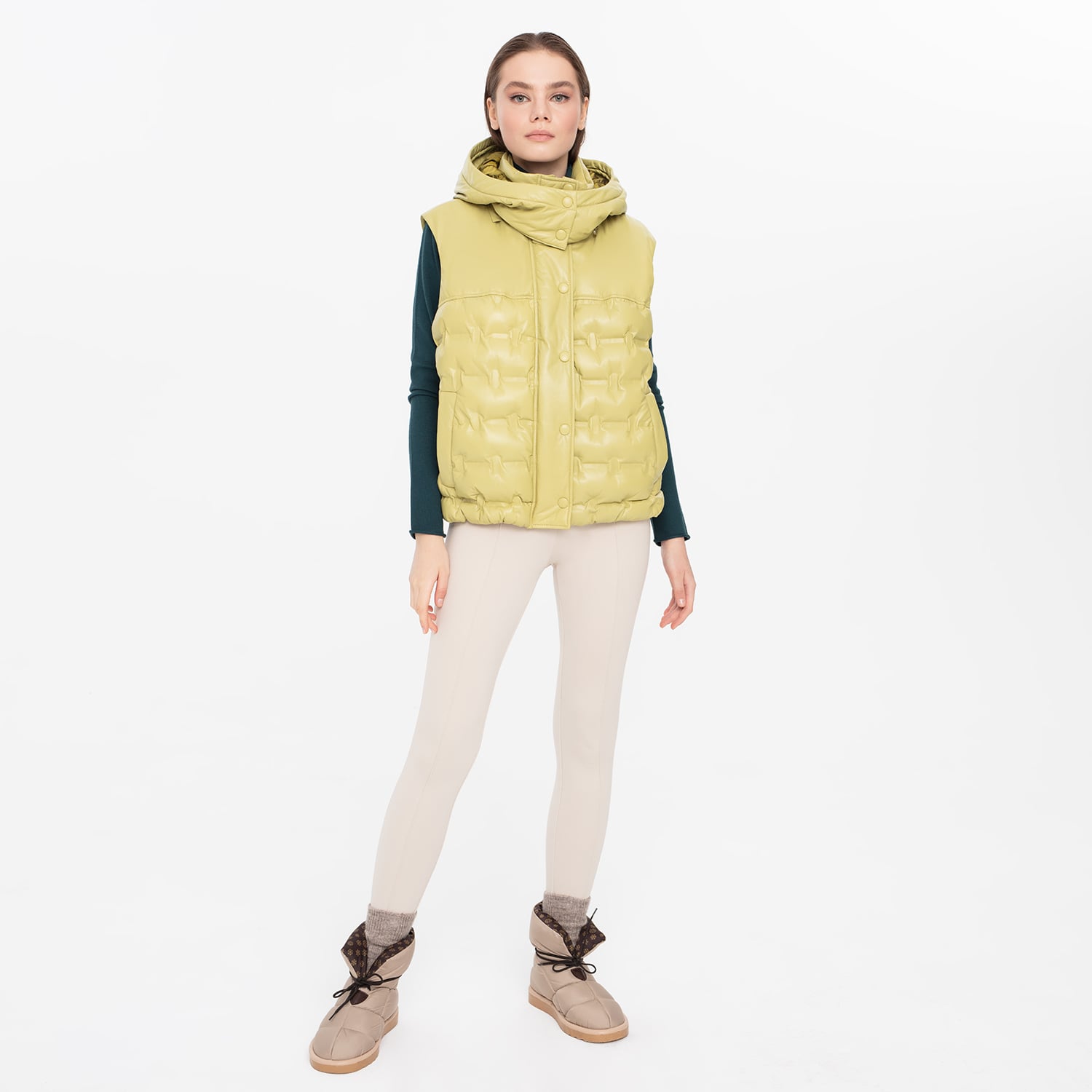 %100 Koyun derisi. Kadın hakim yakalı, çıkma kapüşonlu şişme puffer deri yelek. Önden metal fermuar ve özel kendi derisinden kaplı çıtçıt kapamalıdır. Altta iki adet yandan girişli cebi mevcuttur. Dekoratif tasarıma sahip, dikiş kullanılmadan özel yapıştırma teknolojisi ile sportif tarzın tamamlanmasına katkıda bulunuyor. Soğuk kış günlerinin rahat ve sıcak geçirilmesini sağlayan model, kalite ve tasarımı bir araya getiren işlevsellik sunuyor. Ürünün içerisindeki, özel dolum malzemesi hafiflik ve sıcaklığı ile kışın vazgeçilmezleri arasına giriyor. %100 koyun derisinden olup özel astarlı çalışılmıştır. Bu ürün, et endüstrisinin yan ürünü olarak elde edilen ve sürdürülebilir yöntemler ile Leather Working Group Altın sertifikalı Desa tesislerinde tabaklanan deriler kullanılarak üretilmiştir.-%100 Koyun derisi. Kadın hakim yakalı, çıkma kapüşonlu şişme puffer deri yelek. Önden metal fermuar ve özel kendi derisinden kaplı çıtçıt kapamalıdır. Altta iki adet yandan girişli cebi mevcuttur. Dekoratif tasarıma sahip, dikiş kullanılmadan özel yapıştırma teknolojisi ile sportif tarzın tamamlanmasına katkıda bulunuyor. Soğuk kış günlerinin rahat ve sıcak geçirilmesini sağlayan model, kalite ve tasarımı bir araya getiren işlevsellik sunuyor. Ürünün içerisindeki, özel dolum malzemesi hafiflik ve sıcaklığı ile kışın vazgeçilmezleri arasına giriyor. %100 koyun derisinden olup özel astarlı çalışılmıştır. Bu ürün, et endüstrisinin yan ürünü olarak elde edilen ve sürdürülebilir yöntemler ile Leather Working Group Altın sertifikalı Desa tesislerinde tabaklanan deriler kullanılarak üretilmiştir.