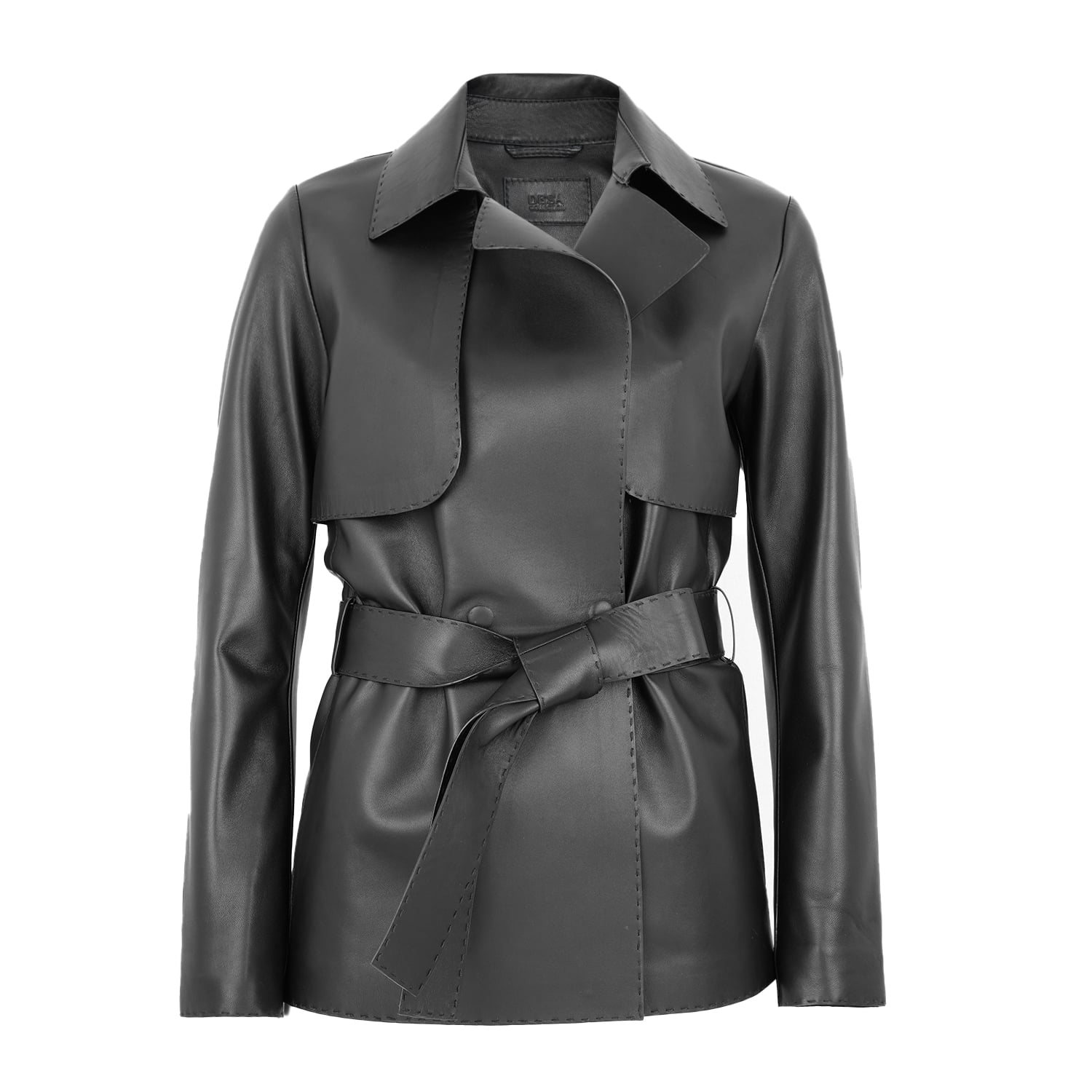 Kadın yakalı deri kısa trençkot. Önden özel kabartma tekniği ile gizli metal çıtçıt kapamalıdır. Ürün üzerine özel işçilikli dekoratif dikiş tekniği uygulanmıştır. Deri bağlama kemeri mevcuttur. Günlük kullanım için çok uygun ve rahat bir kalıptır. %100 koyun derisinden olup, astarsız çalışılmıştır. Bu ürün, et endüstrisinin yan ürünü olarak elde edilen ve sürdürülebilir yöntemler ile Leather Working Group Altın sertifikalı Desa tesislerinde tabaklanan deriler kullanılarak üretilmiştir.-Kadın yakalı deri kısa trençkot. Önden özel kabartma tekniği ile gizli metal çıtçıt kapamalıdır. Ürün üzerine özel işçilikli dekoratif dikiş tekniği uygulanmıştır. Deri bağlama kemeri mevcuttur. Günlük kullanım için çok uygun ve rahat bir kalıptır. %100 koyun derisinden olup, astarsız çalışılmıştır. Bu ürün, et endüstrisinin yan ürünü olarak elde edilen ve sürdürülebilir yöntemler ile Leather Working Group Altın sertifikalı Desa tesislerinde tabaklanan deriler kullanılarak üretilmiştir.