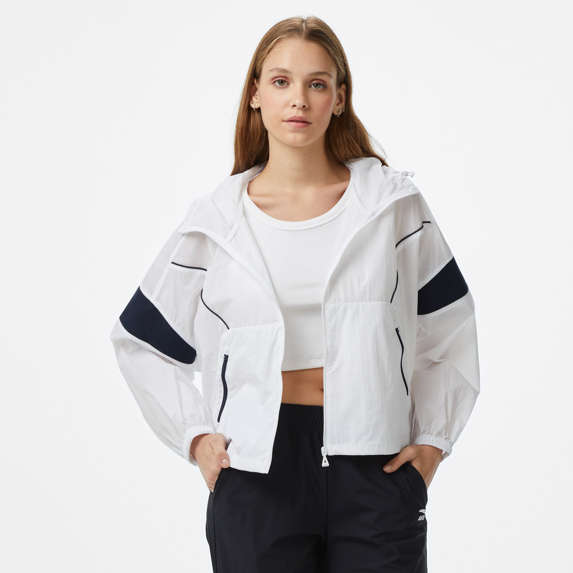 Anta Sports Kadın Beyaz Eşofman Üstü minimal beyaz tasarımıyla spor ve günlük giyim arasında köprü kurar