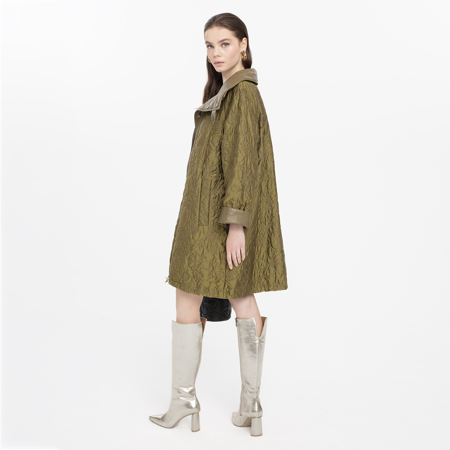 Çift taraflıdır. Kumaş yüzünde özel desenli ve ip ile kapitone çalışması uygulanmıştır. Etek ucunda kulisan çalışması mevcuttur. Ürünün içerisindeki özel dolum malzemesi hafiflik ve sıcaklığı ile kışın vazgeçilmezleri arasına giriyor. Ön yüzü %100 koyun derisindendir. Diğer yüzü özel su itici kumaş kullanılmıştır. Bu ürün, et endüstrisinin yan ürünü olarak elde edilen ve sürdürülebilir yöntemler ile Leather Working Group Altın sertifikalı Desa tesislerinde tabaklanan deriler kullanılarak üretilmiştir.