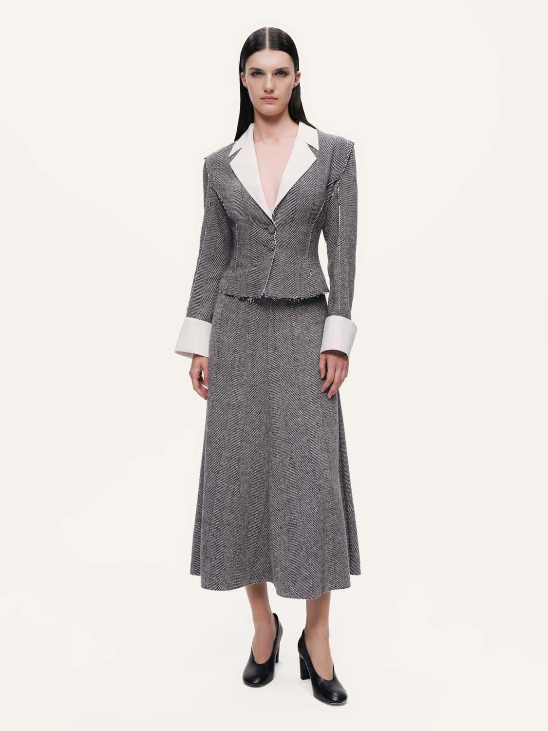 Bu balıksırtı desenli, kloş midi etekle, zamansız zarafet modern bir dokunuşla buluşuyor. Yumuşak dokulu dokuma kumaştan üretilen etek, orta yükseklikte bir bel, görünmez arka fermuar ve her adımda zarif bir şekilde hareket eden, hoş bir A kesim siluete sahip. Klasik balıksırtı örgüsü, doku ve derinlik katarak hem şık hem de günlük kullanıma uygun bir parça haline getiriyor. Astar: Astarsız Kalıp: Regular Fit Beden Önerisi: Kendi bedeninizi tercih etmenizi tavsiye ederiz. Model Ürün Bedeni: S Model Bedeni: Boy 1.79 / Göğüs 83 cm / Bel 64 cm / Kalça 90 cm