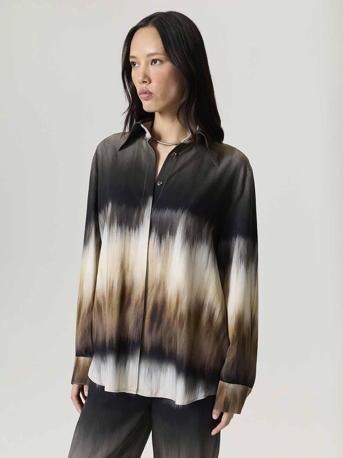 Rahatlığı ve şıklığı bir arada sunan bu batik desenli gömlek, relaxed fit kesimi ve tam kalıbıyla vücuda konforlu bir uyum sağlıyor. Astarsız dokuma kumaşı hafif bir akış sunarken, uzun kollar ve gizli düğme kapaması tasarıma sade ve modern bir şıklık kazandırıyor. Günlük kombinlerden hafta sonu buluşmalarına kadar her an stilinizi ön plana çıkaracak zarif bir parça. Kalıp: Relaxed Fit Model Ürün Bedeni: S