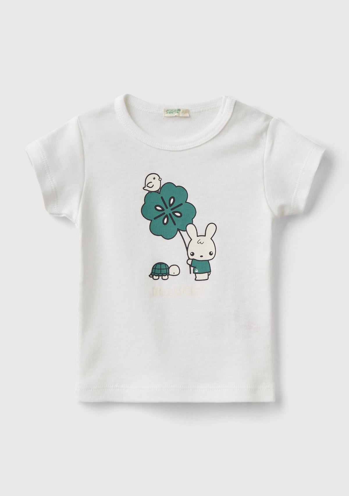 Bebek Beyaz. Önü Grafik Baskılı Omzu Çıtçıtlı Bisiklet Yaka T-Shirt