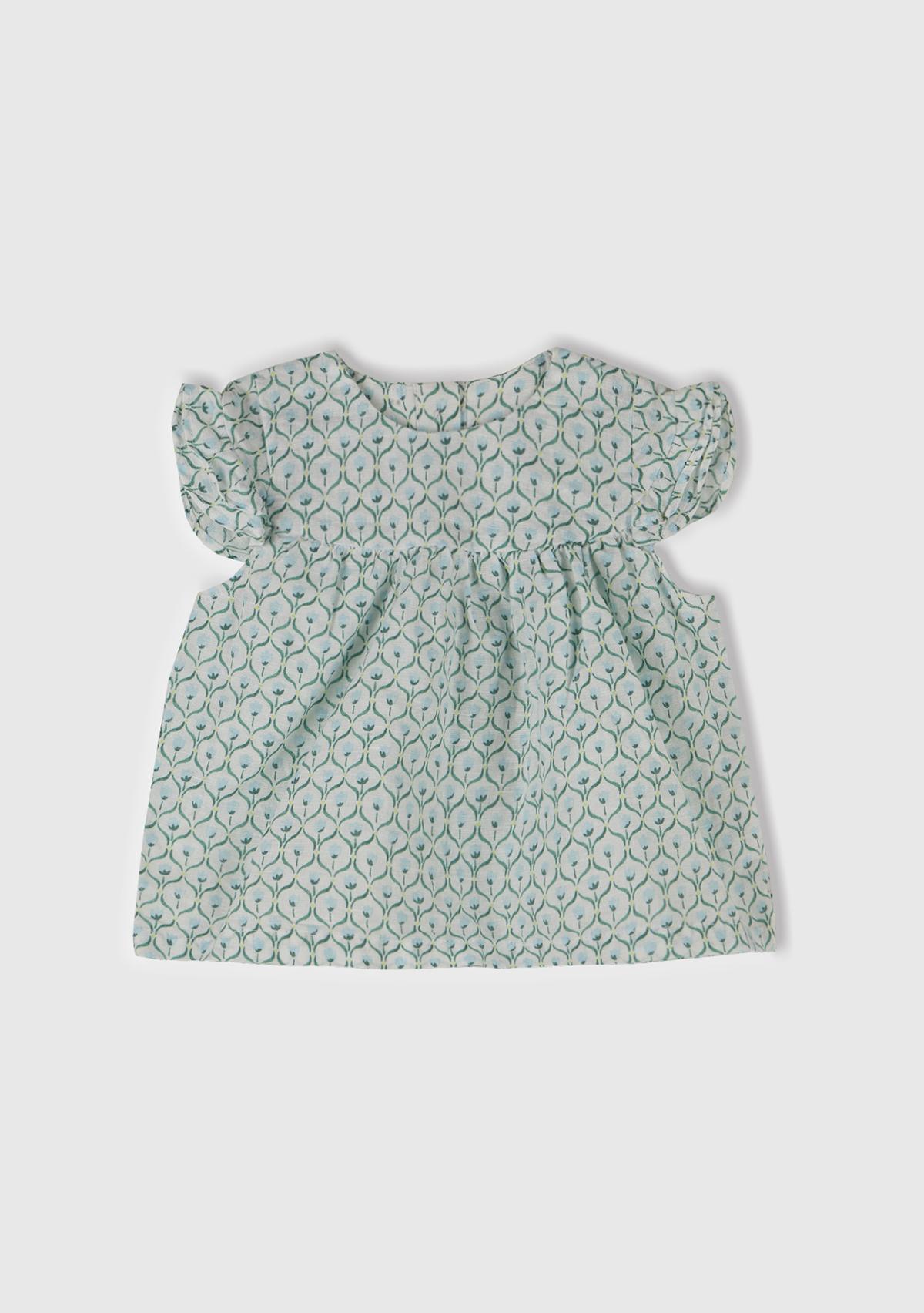 Bebek Buz Mavi Tamamı Desenli Kolu Fırfırlı Arkası Düğmeli Gömlek