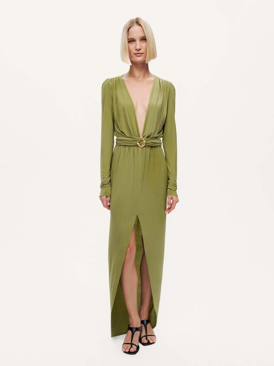 Feminen zarafeti modern bir ışıltıyla buluşturan bu bel aksesuar detaylı maxi elbise, her adımda etkileyici bir siluet sunuyor. Regular fit kesimiyle vücuda zarifçe otururken, derin V yaka tasarımı feminen bir duruş kazandırır. Drapeli formu ve bel kısmındaki metal aksesuar detayı, bedeni vurgulayan sofistike bir hareket yaratır. Uzun kolları ve yırtmaç detayıyla dengeli bir şıklık sunan elbise, akıcı örme kumaşı sayesinde konfor ve zarafeti bir araya getirir. Astarsız yapısı hafiflik hissi verirken, özel davetlerden gece organizasyonlarına kadar her ortamda göz alıcı bir duruş garanti eder. Kalıp: Regular Fit Model Ürün Bedeni: S Model Bedeni: Boy 1.77 / Göğüs 82 cm / Bel 61 cm / Kalça 89 cm