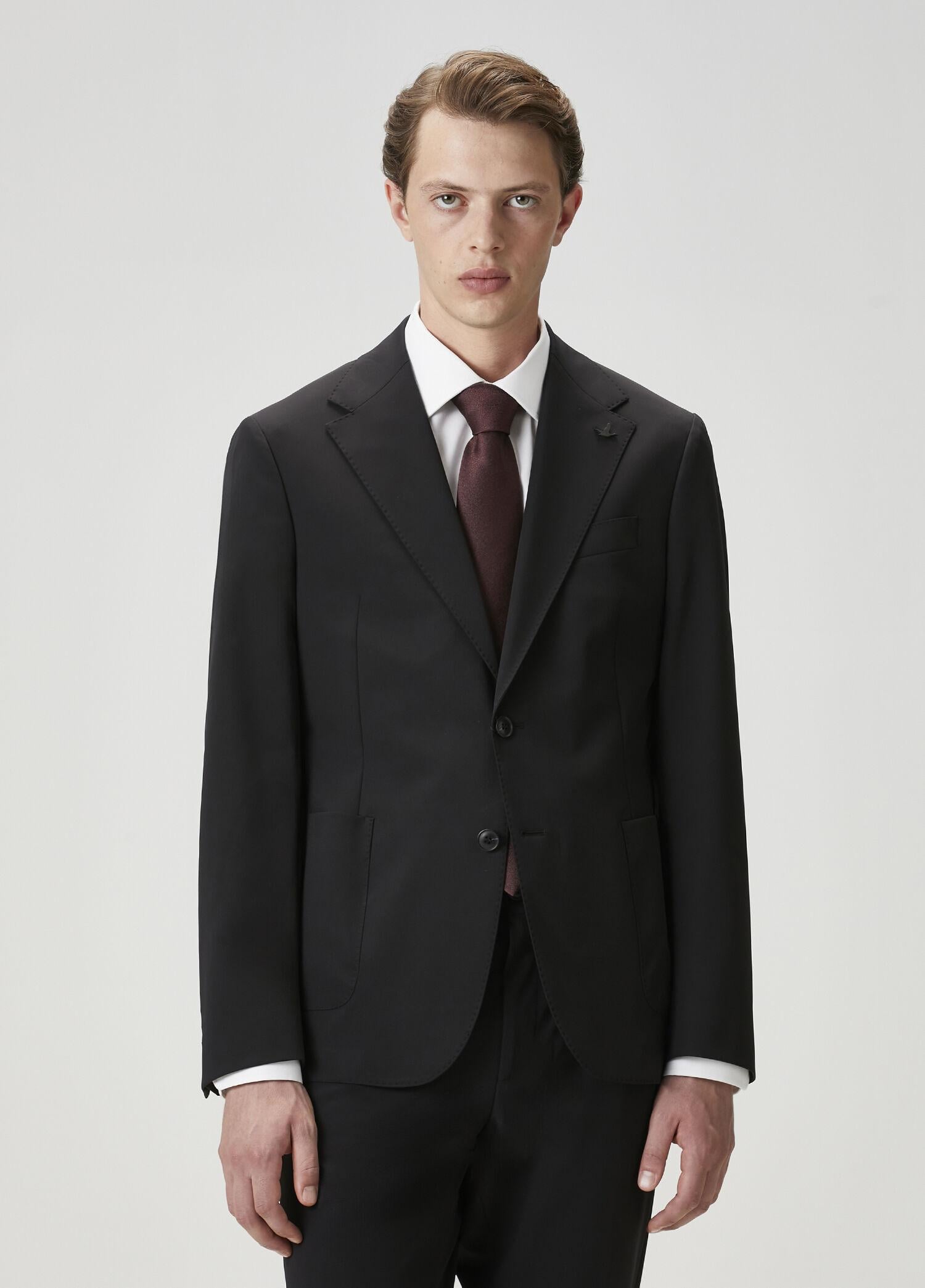 Kelebek yaka, düğme kapatmalı ceket. Düz renk, yırtmaçlı. 3 adet dış cepli, 2 adet iç cepli