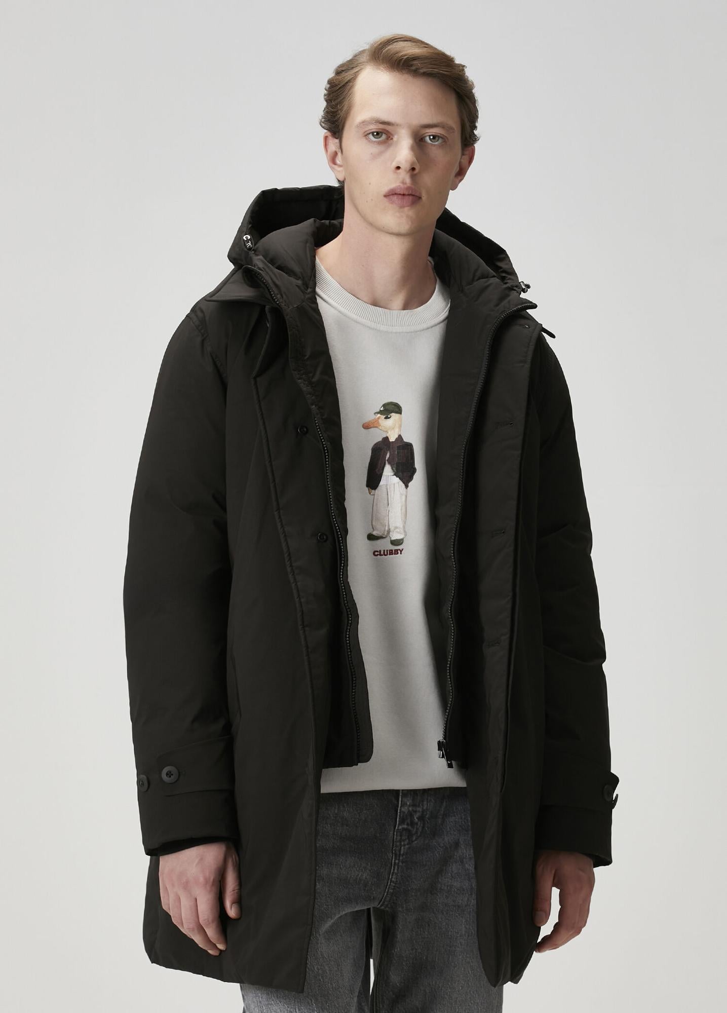 Kapüşonlu, fermuar kapatmalı, düğmeli kaban. Çıkarılabilir iç yaka detaylı. Logolu, 2 adet dış cepli, 1 adet iç cepli. Su ve rüzgaritici malzemeden üretilmiştir. Ürün bedeni: M / Model ölçüsü: Boy: 188 cm - Göğüs: 88 cm - Bel: 74 cm - Kalça: 95 cm.