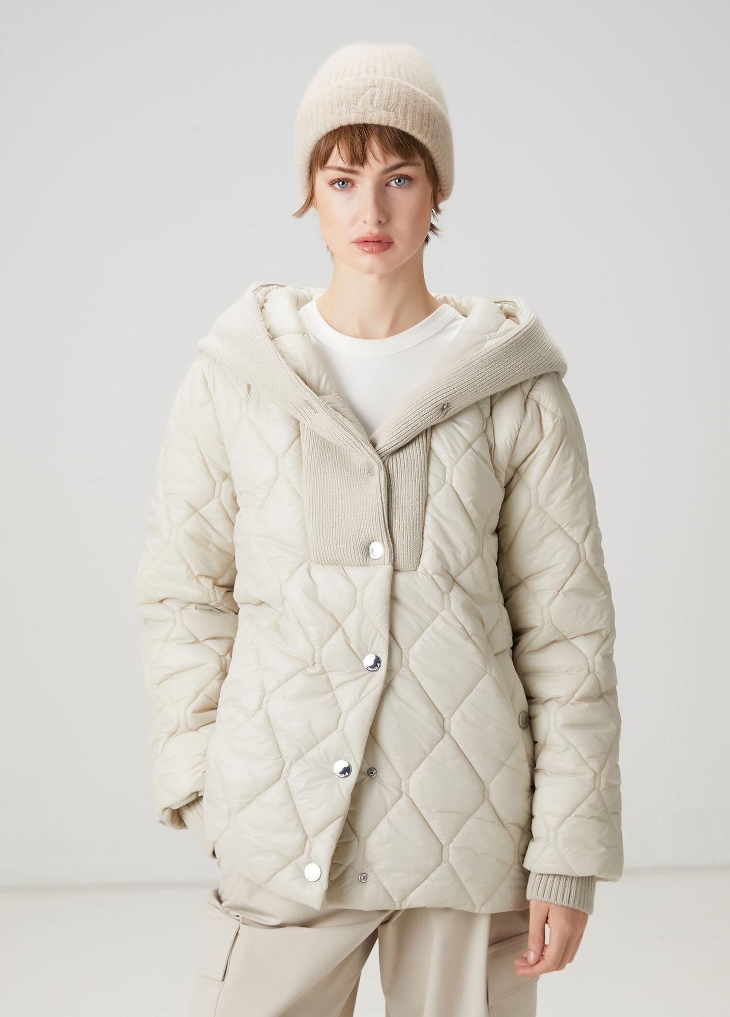 Kapüşonlu, çıtçıt kapatmalı, triko garnili mont. Kapitoneli, 2 adet cepli. Ürün bedeni: S / Model ölçüsü: Boy: 178 cm - Göğüs: 82 cm - Bel: 62 cm - Kalça: 89 cm.