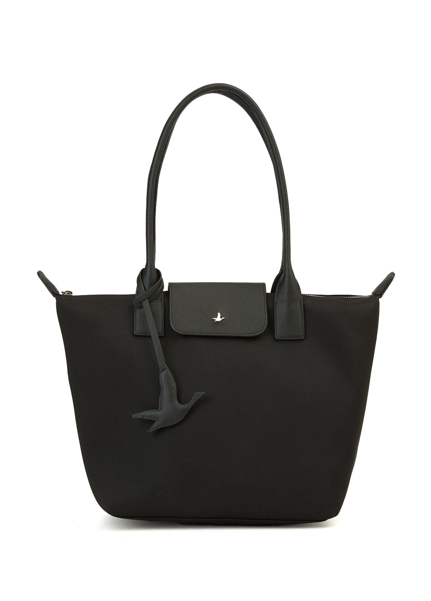 Çift kulplu, fermuar kapatmalı, logo aksesuarlı çanta. Çıtçıtlı, düz renk. 30x27 cm