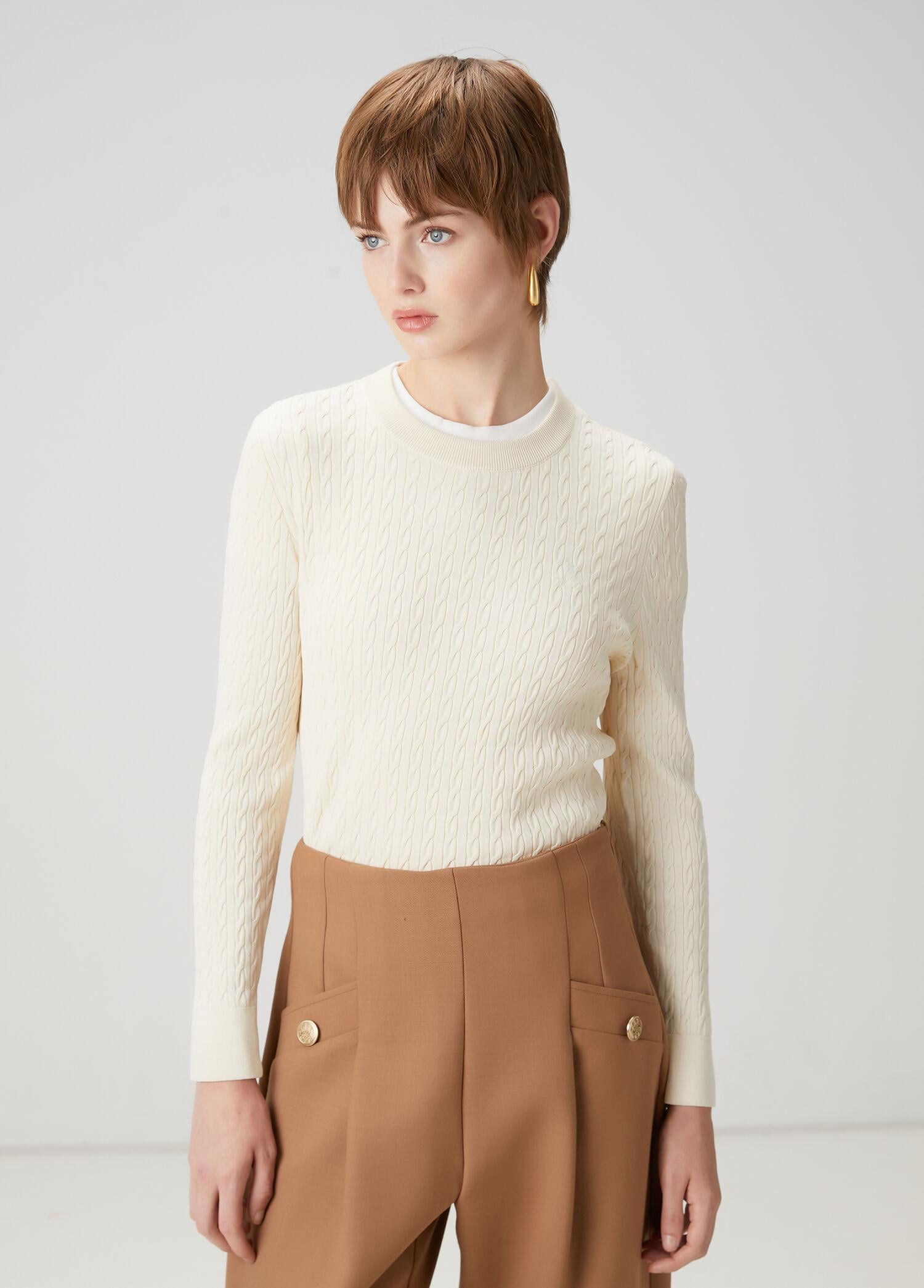Bisiklet yaka, logo nakışlı, saç örgü kazak. Ürün bedeni: S / Model ölçüsü: Boy: 178 cm - Göğüs: 82 cm - Bel: 62 cm - Kalça: 89 cm.