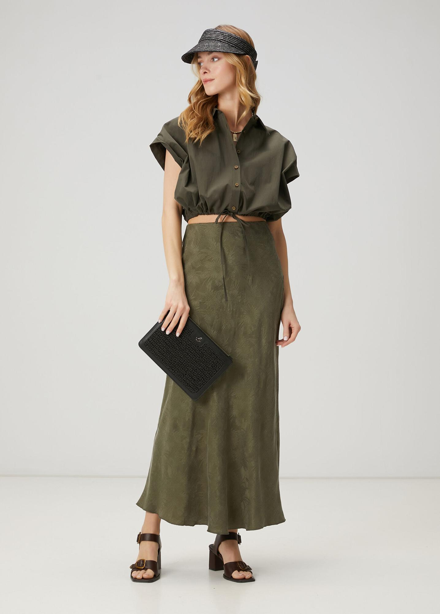 Regular Fit. Yüksek bel, jakarlı, maksi boy, ipek evaze etek. Yanı fermuar kapatmalı. Bu ürün, üretim süreçlerinde çevresel etkilerin sürekli olarak izlendiği ve iyileştirildiği bir çevresel yönetim sistemi kapsamında üretilmiştir. Ürün bedeni: 34 / Model ölçüsü:Boy: 174 cm -Göğüs: 81 cm- Bel: 62 cm - Kalça: 91 cm.