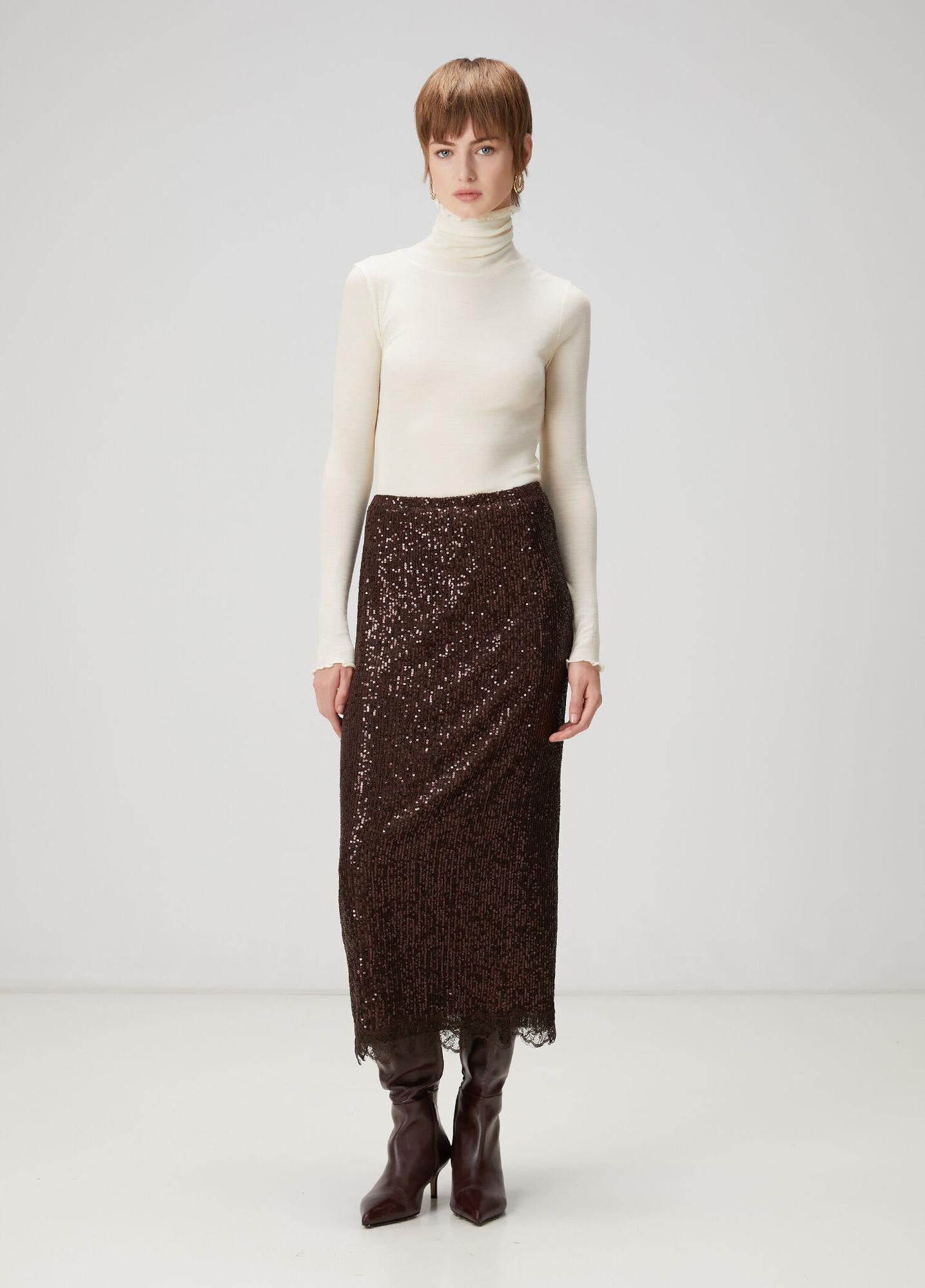 Payetli, dantel detaylı, pullu, midi boy etek. Ürün bedeni: S / Model ölçüsü: Boy: 178 cm - Göğüs: 82 cm - Bel: 62 cm - Kalça: 89 cm.