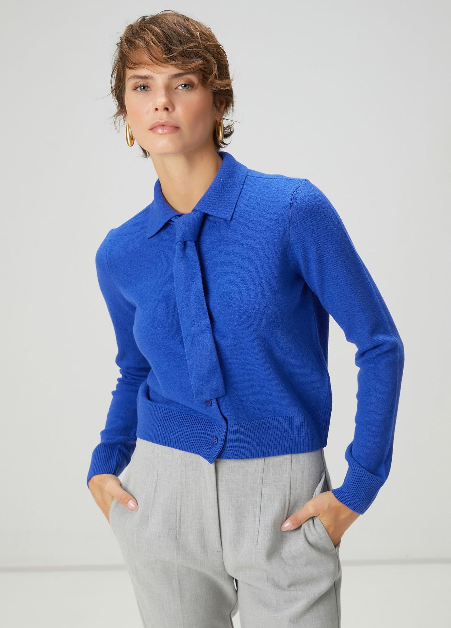 Polo yaka, kravat detaylı, yün hırka. Düğme kapatmalı. Ürün bedeni: S / Model ölçüsü: Boy: 172 cm - Göğüs: 83 cm - Bel: 62 cm - Kalça: 91 cm. Yeni sezon hazır giyim alışverişlerinizde ücretsiz tadilat yapılmaktadır