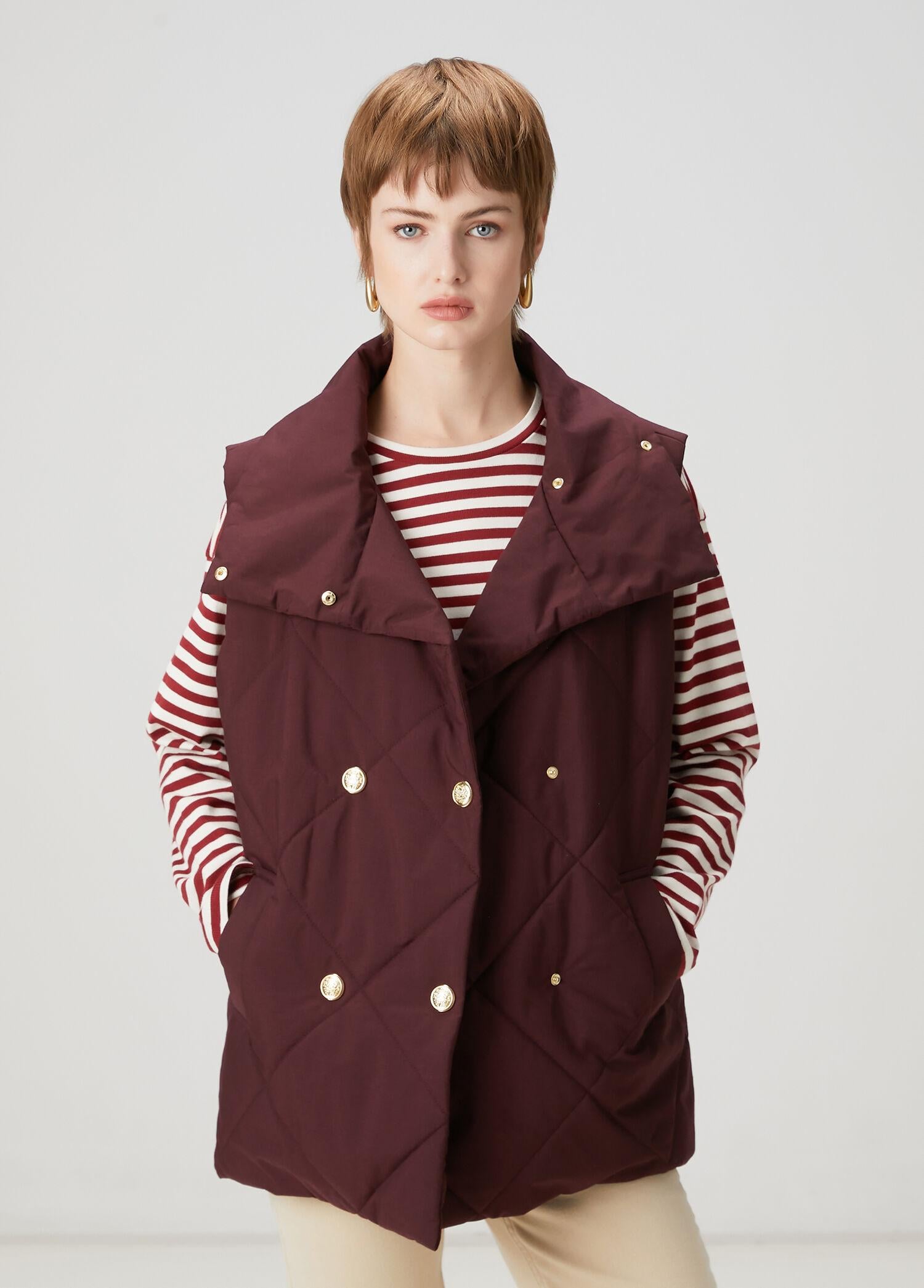 Büyük dik yaka, kapitoneli, kruvaze yelek. Gold düğmeli, kapitoneli. 2 adet cepli. Ürün bedeni: S / Model ölçüsü: Boy: 178 cm - Göğüs: 82 cm - Bel: 62 cm - Kalça: 89 cm.