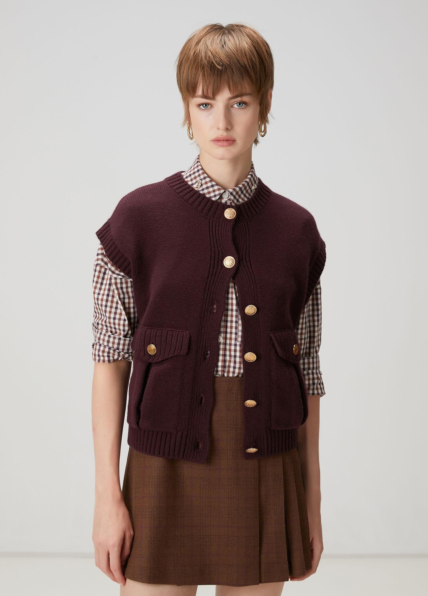 Bisiklet yaka, gold düğmeli, triko yelek. 2 adet cepli. Ürün bedeni: S / Model ölçüsü: Boy: 178 cm - Göğüs: 82 cm - Bel: 62 cm - Kalça: 89 cm. Yeni sezon hazır giyim alışverişlerinizde ücretsiz tadilat yapılmaktadır