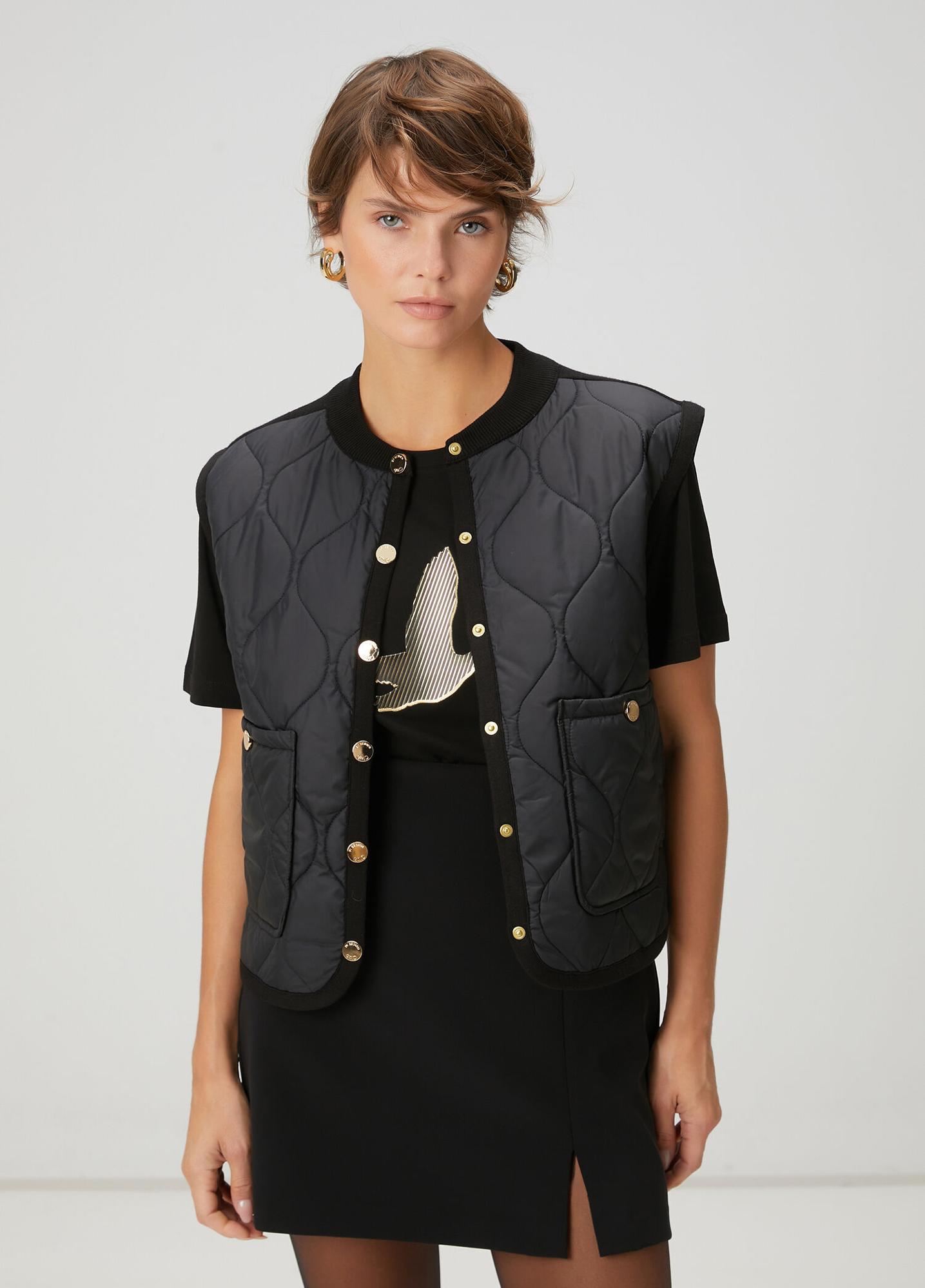 Bisiklet yaka, çıtçıt kapatmalı yelek. Kapitoneli, sırtı triko garnili. 2 adet cepli. Ürün bedeni: S / Model ölçüsü: Boy: 172 cm - Göğüs: 83 cm - Bel: 62 cm - Kalça: 91 cm.