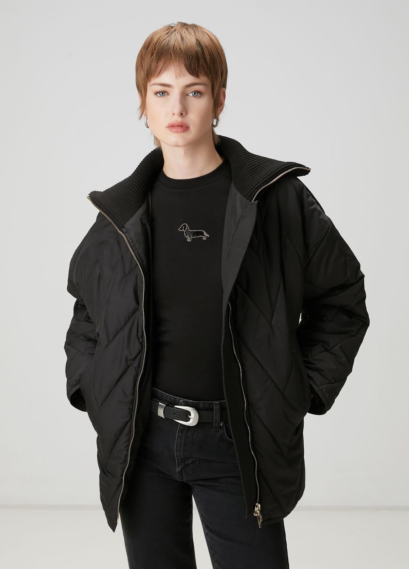 Dik yaka, fermuar kapatmalı mont. Kapitoneli, yakası triko garnili. 2 adet cepli. Ürün bedeni: S / Model ölçüsü: Boy: 178 cm - Göğüs: 82 cm - Bel: 62 cm - Kalça: 89 cm.
