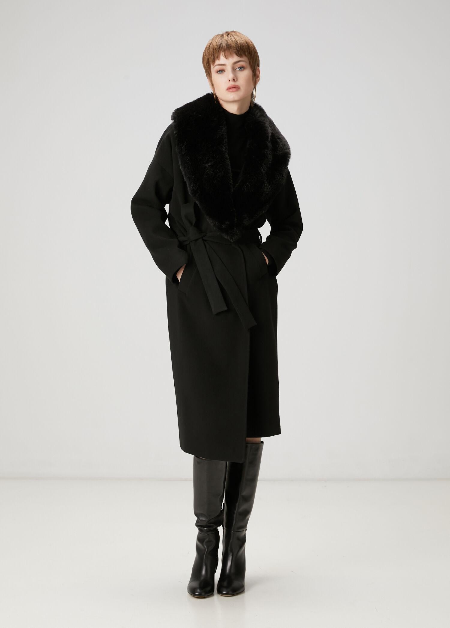 Kürk yaka, beli kuşaklı, kruvaze palto. Astarlı, 2 adet cepli. Ürün bedeni: S / Model ölçüsü: Boy: 178 cm - Göğüs: 82 cm - Bel: 62 cm - Kalça: 89 cm.
