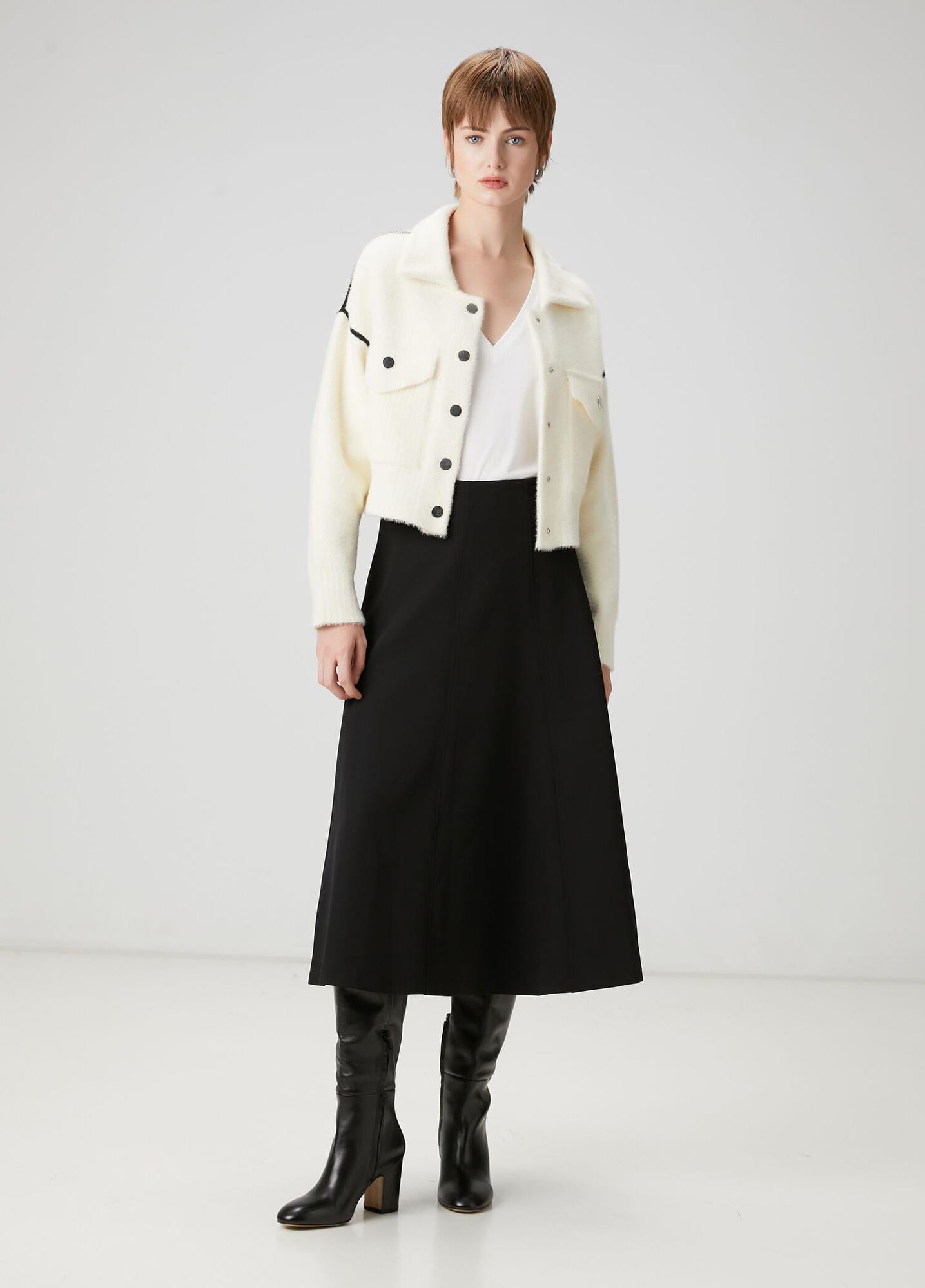 Yüksek bel, midi boy, tok kumaş, kloş etek. Ürün bedeni: 36 / Model ölçüsü: Boy: 178 cm Göğüs: 85 cm Bel: 59 cm Kalça: 91 cm.