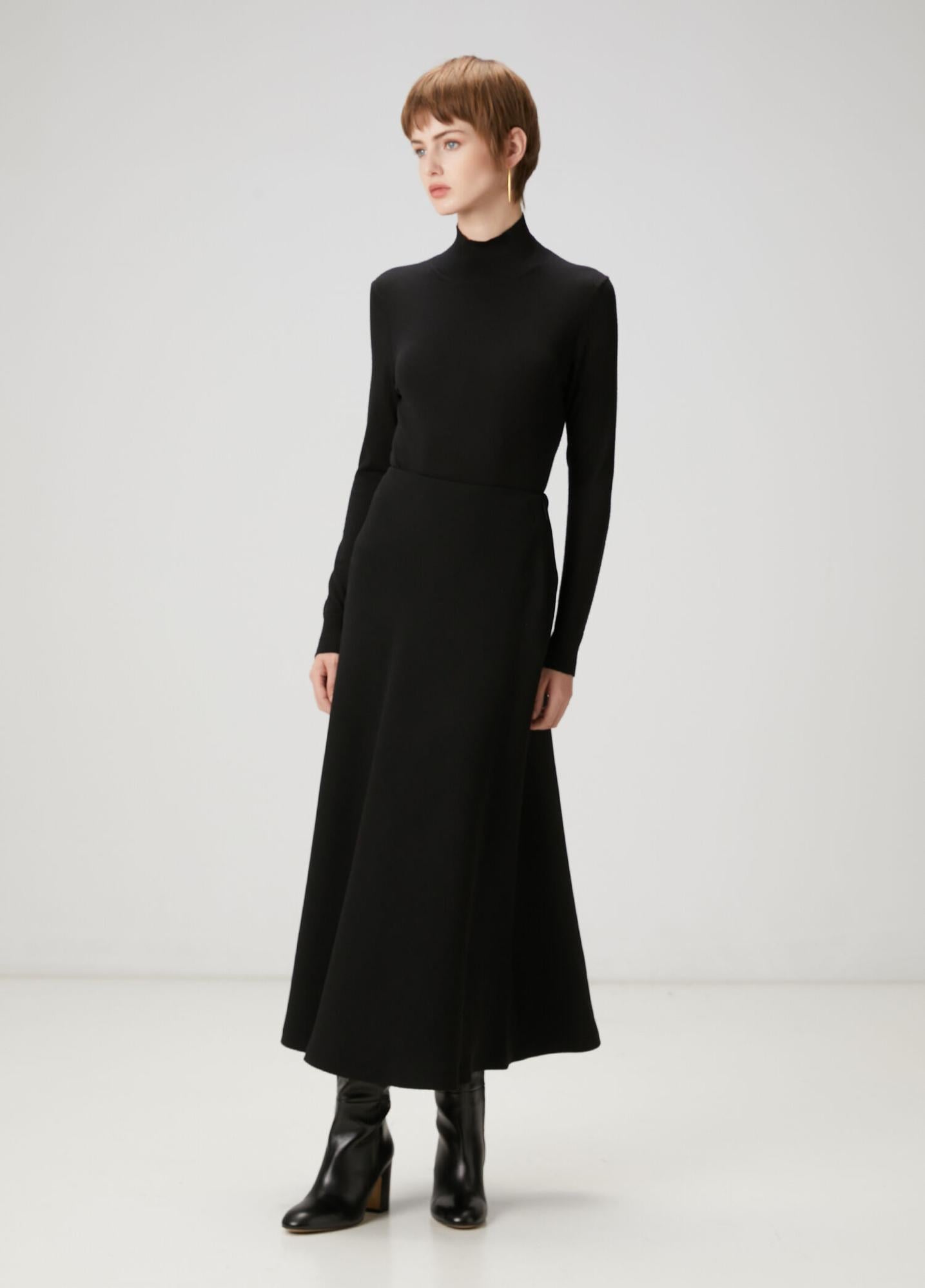 Yüksek bel, midi boy, A kesim krep etek. Ürün bedeni: 36 / Model ölçüsü: Boy: 178 cm - Göğüs: 82 cm - Bel: 62 cm - Kalça: 89 cm.
