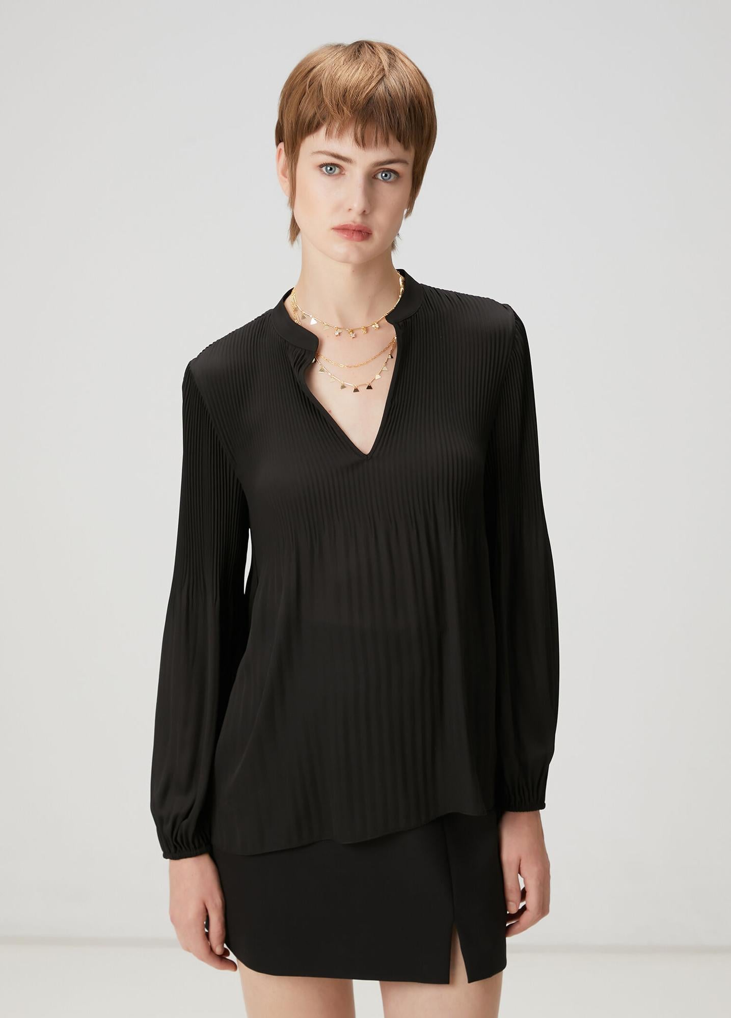 Hakim yaka, pileli, şifon bluz. Ürün bedeni: S / Model ölçüsü: Boy: 178 cm - Göğüs: 82 cm - Bel: 62 cm - Kalça: 89 cm.