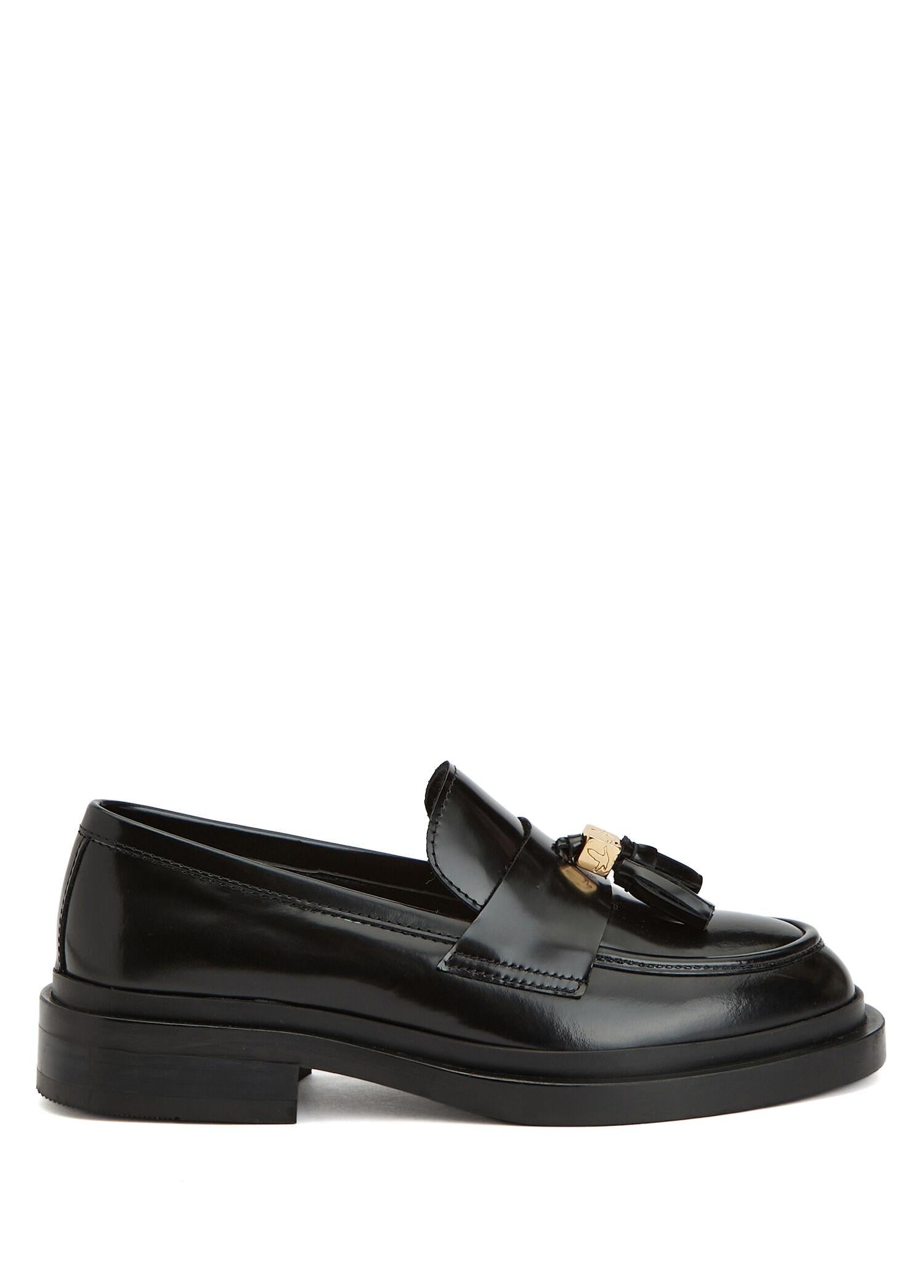 Yuvarlak burun, püsküllü, deri loafer. Küp kaz logo detaylı