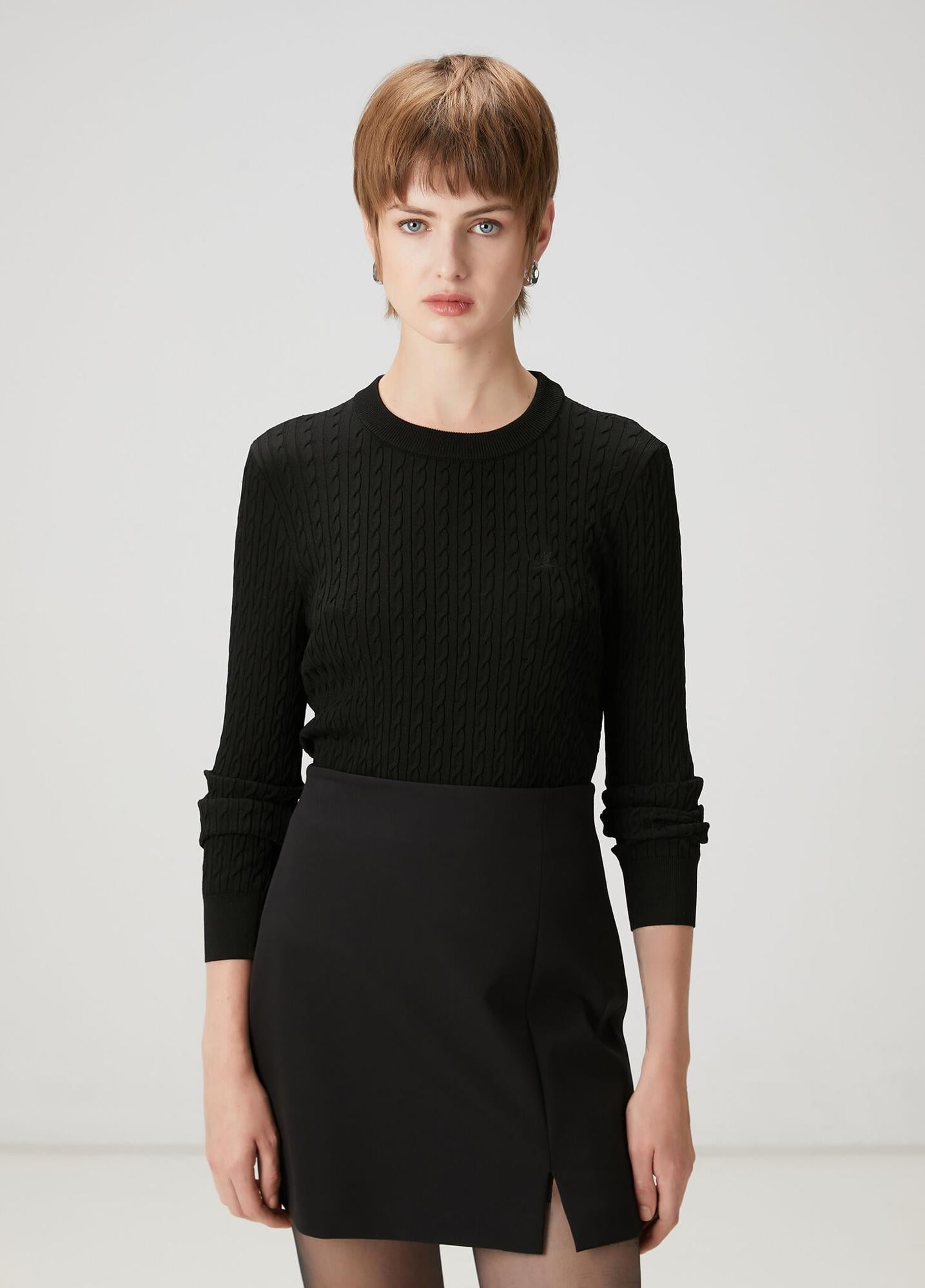 Bisiklet yaka, logo nakışlı, saç örgü kazak. Ürün bedeni: S / Model ölçüsü: Boy: 178 cm - Göğüs: 82 cm - Bel: 62 cm - Kalça: 89 cm.