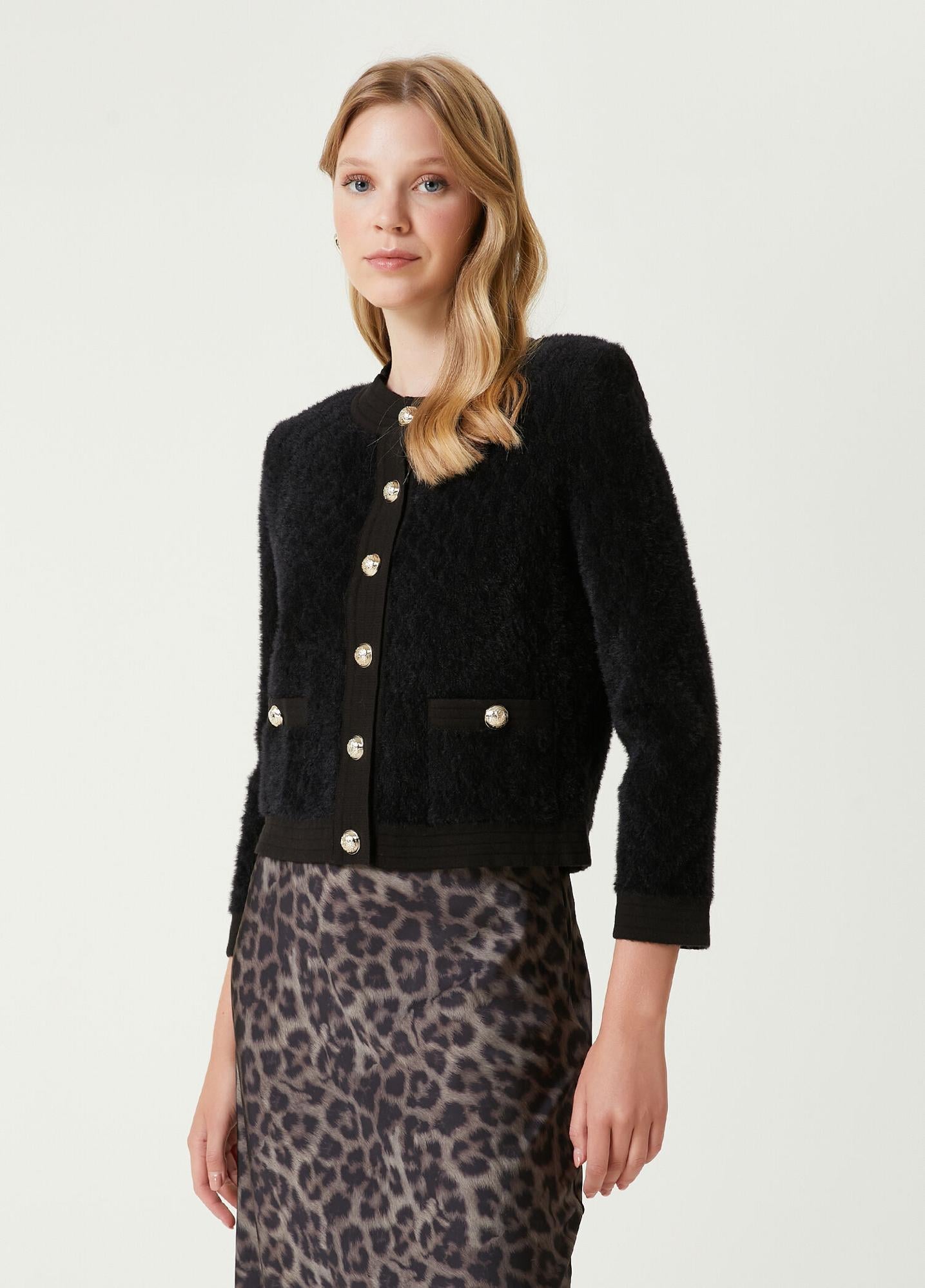 Dik yaka, metal düğmeli, tüylü hırka. 2 adet cepli. Ürün bedeni: S / Model ölçüsü: Boy: 176 cm - Göğüs: 86 cm - Bel: 60 cm - Kalça:90 cm.