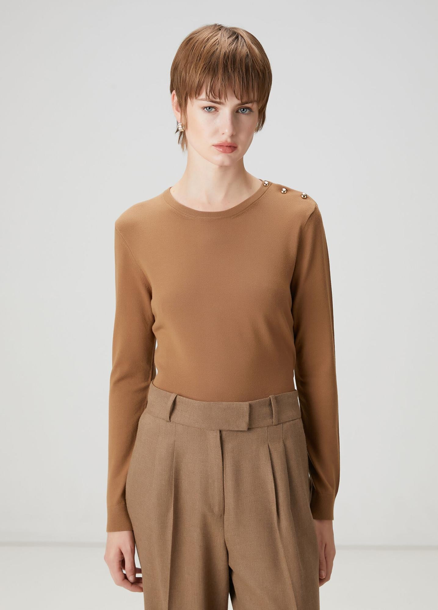 Bisiklet yaka, omuzu düğme detaylı triko. Ürün bedeni: S / Model ölçüsü: Boy: 178 cm - Göğüs: 82 cm - Bel: 62 cm - Kalça: 89 cm.