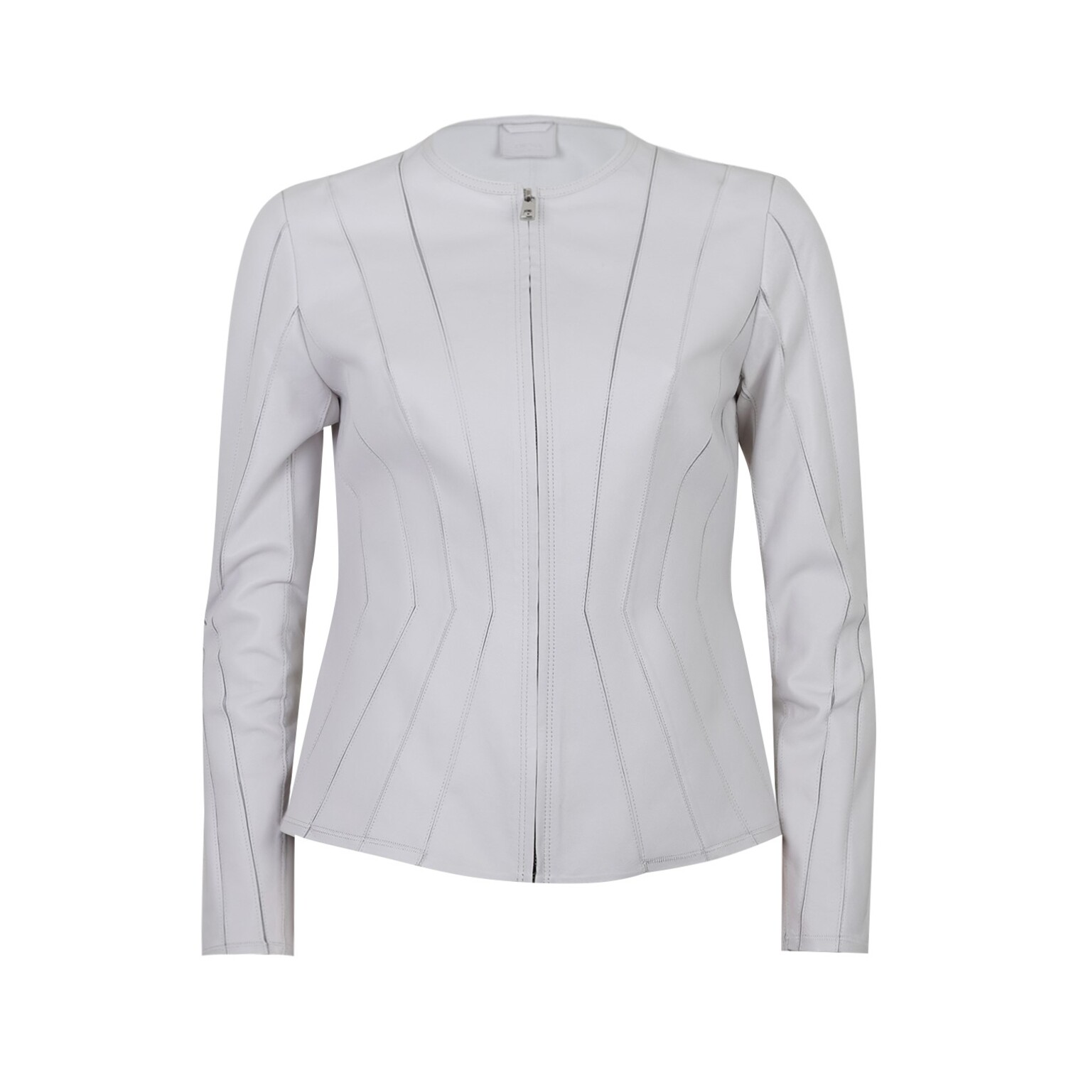 Kadın yuvarlak yakalı fit panelli deri ceket. Önden metal fermuar kapamalıdır. Özel panelleme tekniği ile üretilmiştir. Kadın vücut anatomisini vurgulamak için, esneyen tül desteği ile bedene yerleştirilen deriler sayesinde hem rahat hem de fit bir görünüm kazandırılmış, özel deri panel ve tül laminasyon çalışması yapılmıştır. %100 koyun derisi olup astarsız çalışılmıştır. Bu ürün, et endüstrisinin yan ürünü olarak elde edilen ve sürdürülebilir yöntemler ile Leather Working Group Altın sertifikalı Desa tesislerinde tabaklanan deriler kullanılarak üretilmiştir.