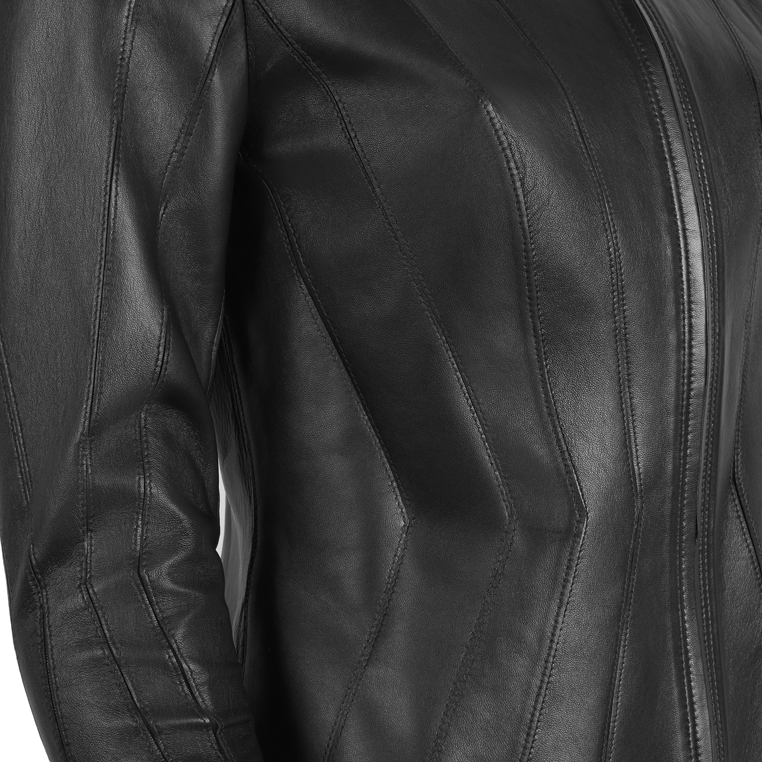 Kadın yuvarlak yakalı fit panelli deri ceket.