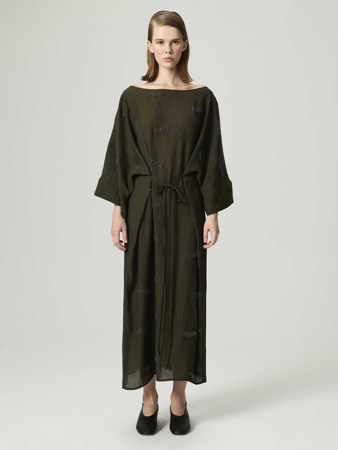 Bu işlemeli kimono tarzı maksi elbiseyle zahmetsiz şıklığın tadını çıkarın. Geniş tekne yakası ve uçuşan kimono kolları ile rahat bir kesime sahip olan bu elbise, silüetinizi belirginleştiren kendinden bağcıklı bir bele sahiptir. Kırışık dokulu kumaştan üretilen ve narin nakışlarla süslenen bu kolay giyilen model, zamansız bir zarafet için düz maksi etek ucuna doğru akar. Güneşli yürüyüşler, akşam etkinlikleri veya her türlü etkinlik için mükemmeldir. Kalıp: Oversize Fit Model Ürün Bedeni: S Model Bedeni: Boy: 1.77cm, Göğüs: 84cm, Bel: 57cm, Basen: 87cm