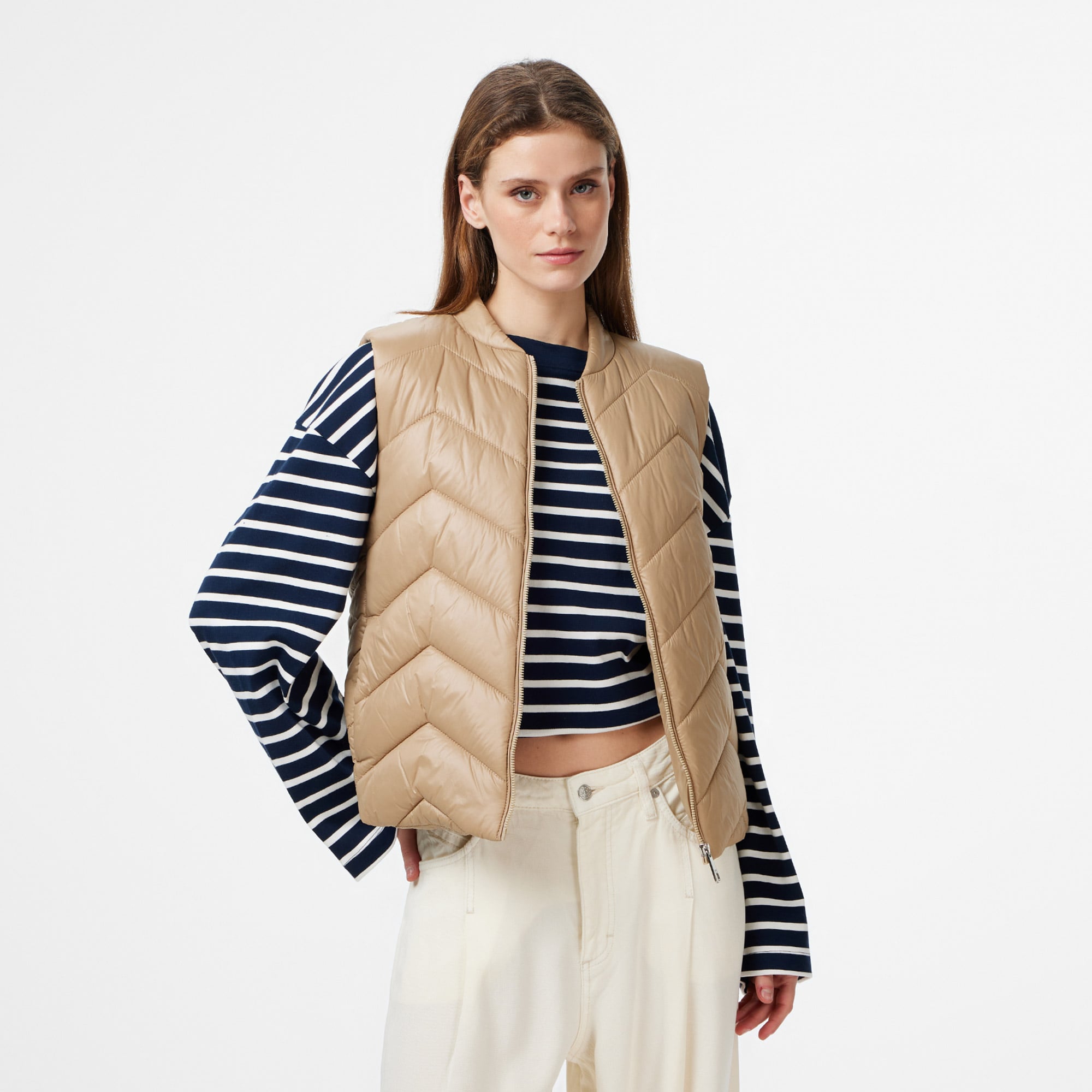 Yelek kesimi ile üst giyimde şık bir katman oluşturur.