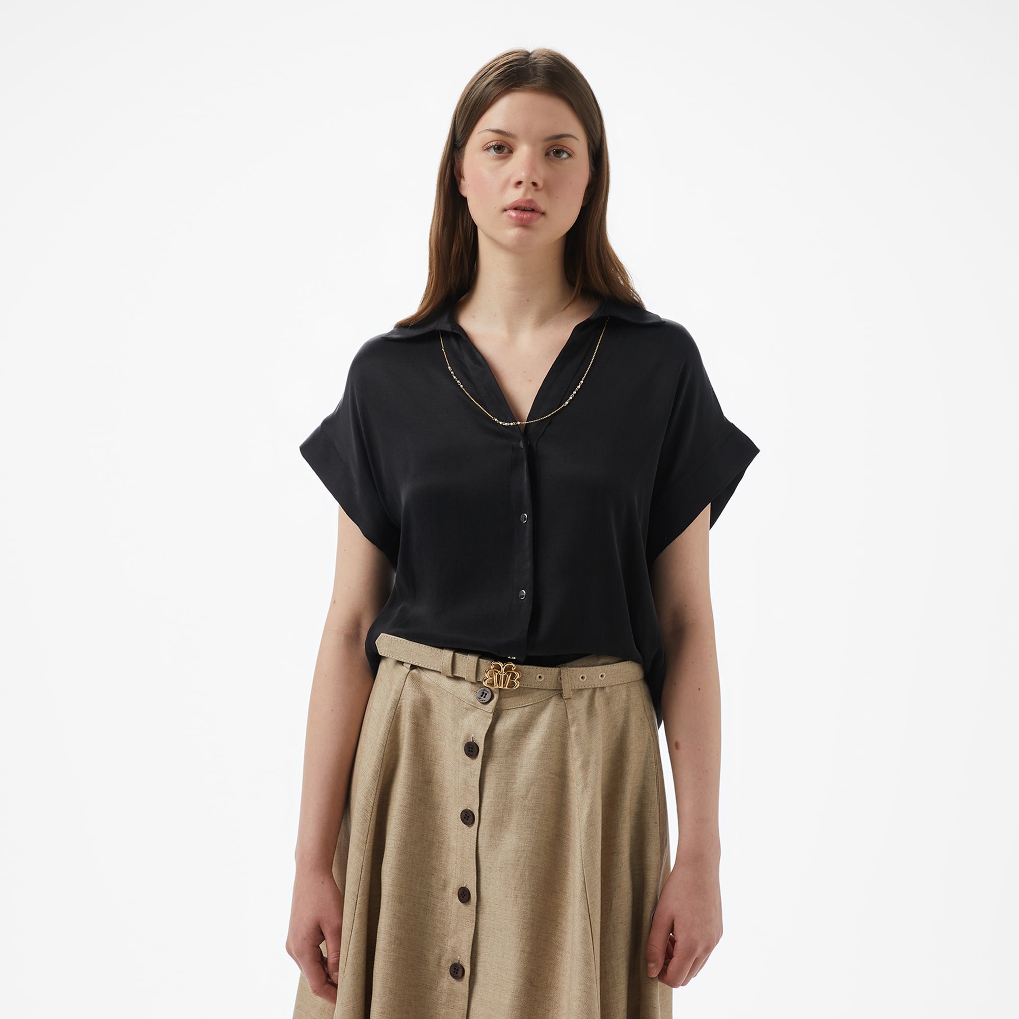 Brooks Brothers Düşük Omuz Metal Çıtcıtlı Kısa Kol Cupro Kadın Siyah Gömlek