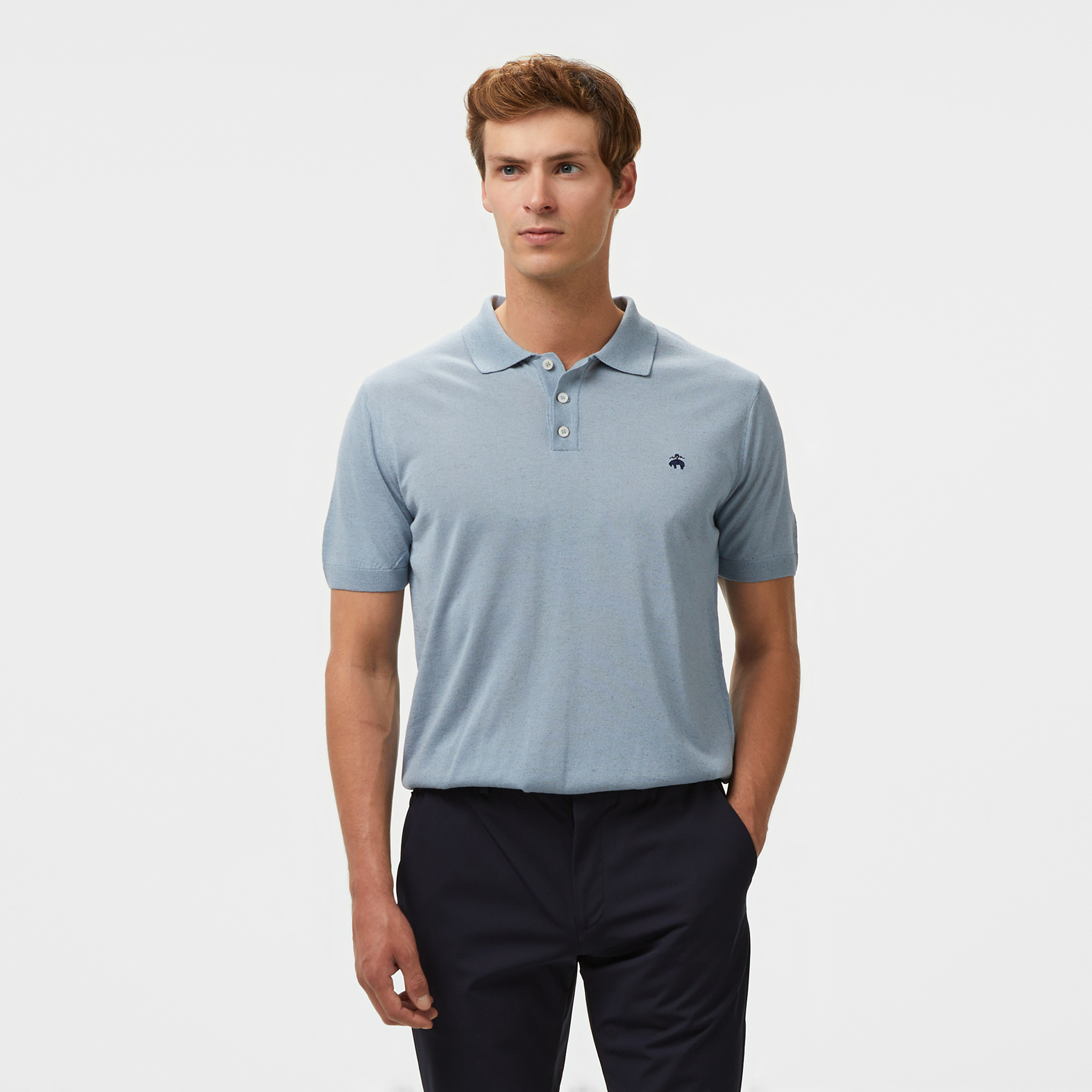 Brooks Brothers Polo Yaka Kısa Kol Keten Karışımlı Erkek Mavi Kazak