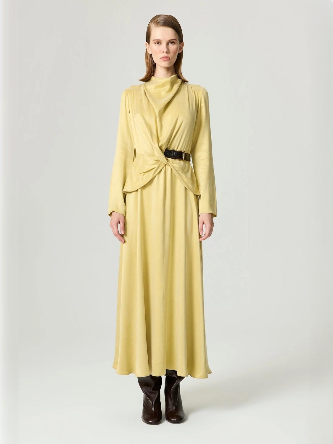 Zahmetsiz şıklığın ustalık örneği olan bu maksi elbise, yüksek dökümlü yakası ve belinde heykelsi tokalı kemeriyle sıkılaşan yumuşak toplanmış yan sarma detayıyla öne çıkıyor. Akıcı dokuma kumaştan üretilen A kesim etek, tam boy eteğe zarif bir şekilde akıyor. Uzun kollar ekstra sofistike bir görünüm sunarken, gizli arka fermuarı pürüzsüz bir uyum sağlıyor. Hafif bir kullanım için astarsız olan bu elbise, resmi davetlerden şık gece planlarına kusursuz bir geçiş sağlıyor. Kalıp: Regular Fit Model Ürün Bedeni: S Model Bedeni: Boy 1.77 / Göğüs 84 cm / Bel 57 cm / Kalça 87 cm