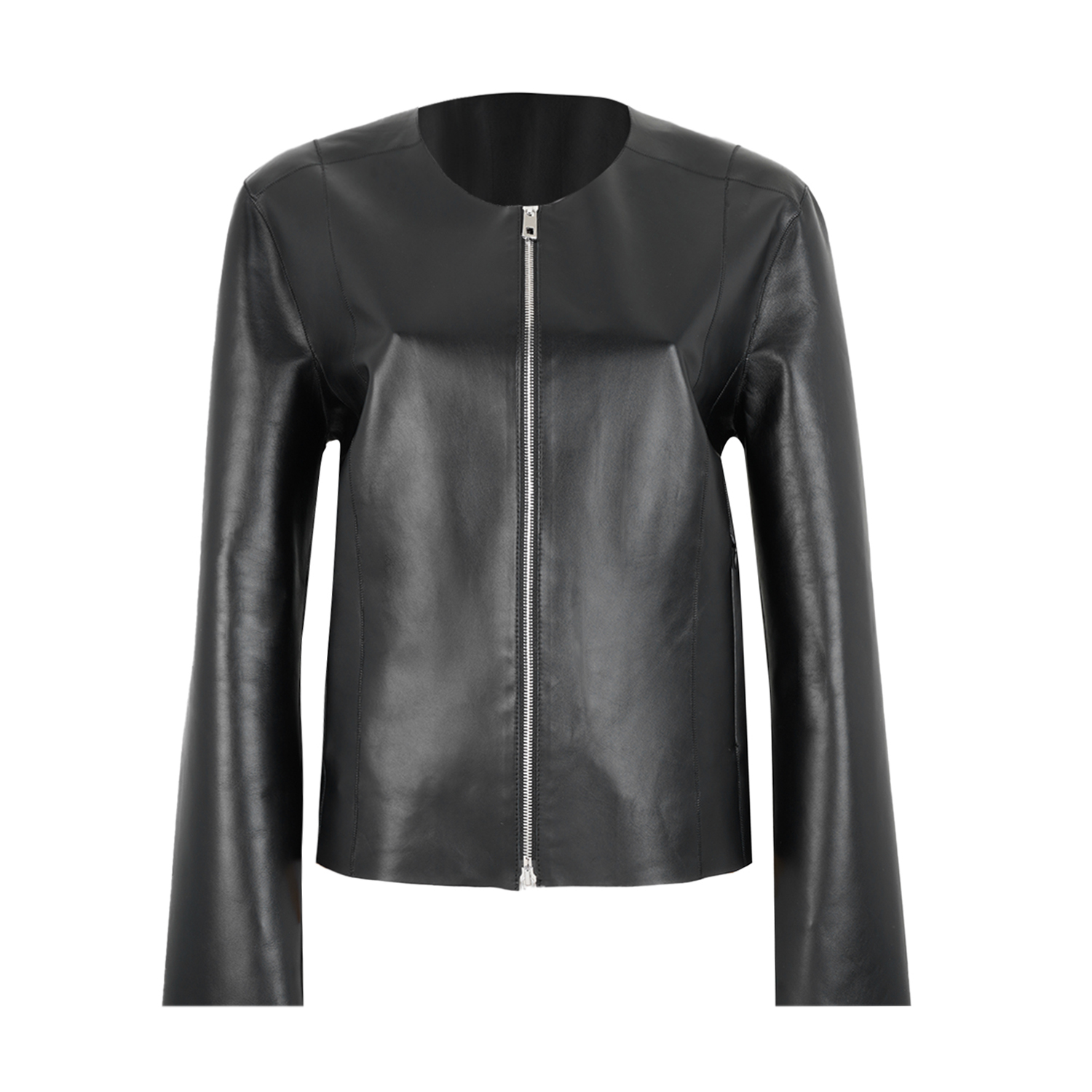 Kadın yuvarlak yakalı deri ceket. Önden metal fermuar kapamalıdır. Altta iki adet yandan girişli gizli fermuarlı cebi mevcuttur. %100 koyun derisidir. Astarsız çalışılmıştır.-Kadın yuvarlak yakalı deri ceket. Önden metal fermuar kapamalıdır. Altta iki adet yandan girişli gizli fermuarlı cebi mevcuttur. %100 koyun derisidir. Astarsız çalışılmıştır.