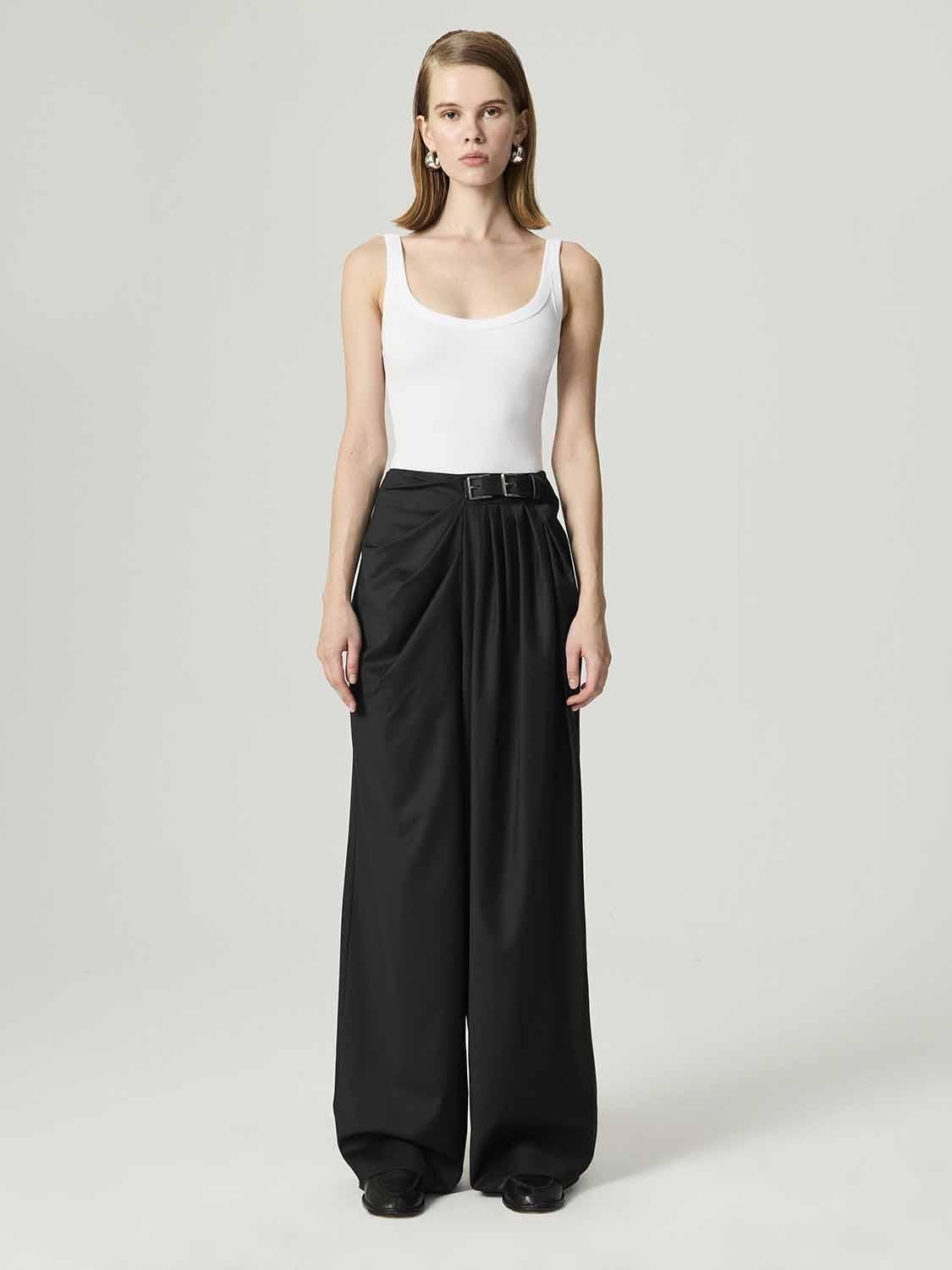 Bu iddialı çift tokalı pantolonla stilinizi bir üst seviyeye taşıyın. Rahat kesimli ve yüksek bel kesimli bu pantolon, asimetrik pileler ve çift tokalı askılarla vurgulanan şekillendirilmiş bir bel bandına sahiptir. Gizli arka fermuarı sade bir görünüm sağlarken, astarsız dokuma kumaş akıcılık ve hareket özgürlüğü sağlar. İster dar bir bluzla ister bol bir örgüyle kombinleyin, bu pantolon sonbahar kombininize yapı ve şıklık katar. Kalıp: Relaxed Fit Beden Önerisi: Kendi bedeninizi tercih etmenizi tavsiye ederiz. Model Ürün Bedeni: XS