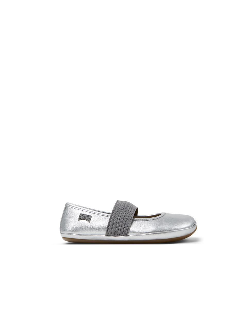 Silver leather kids' ballerina with EVA footbed and recycled rubber outsoles (20% recycled).