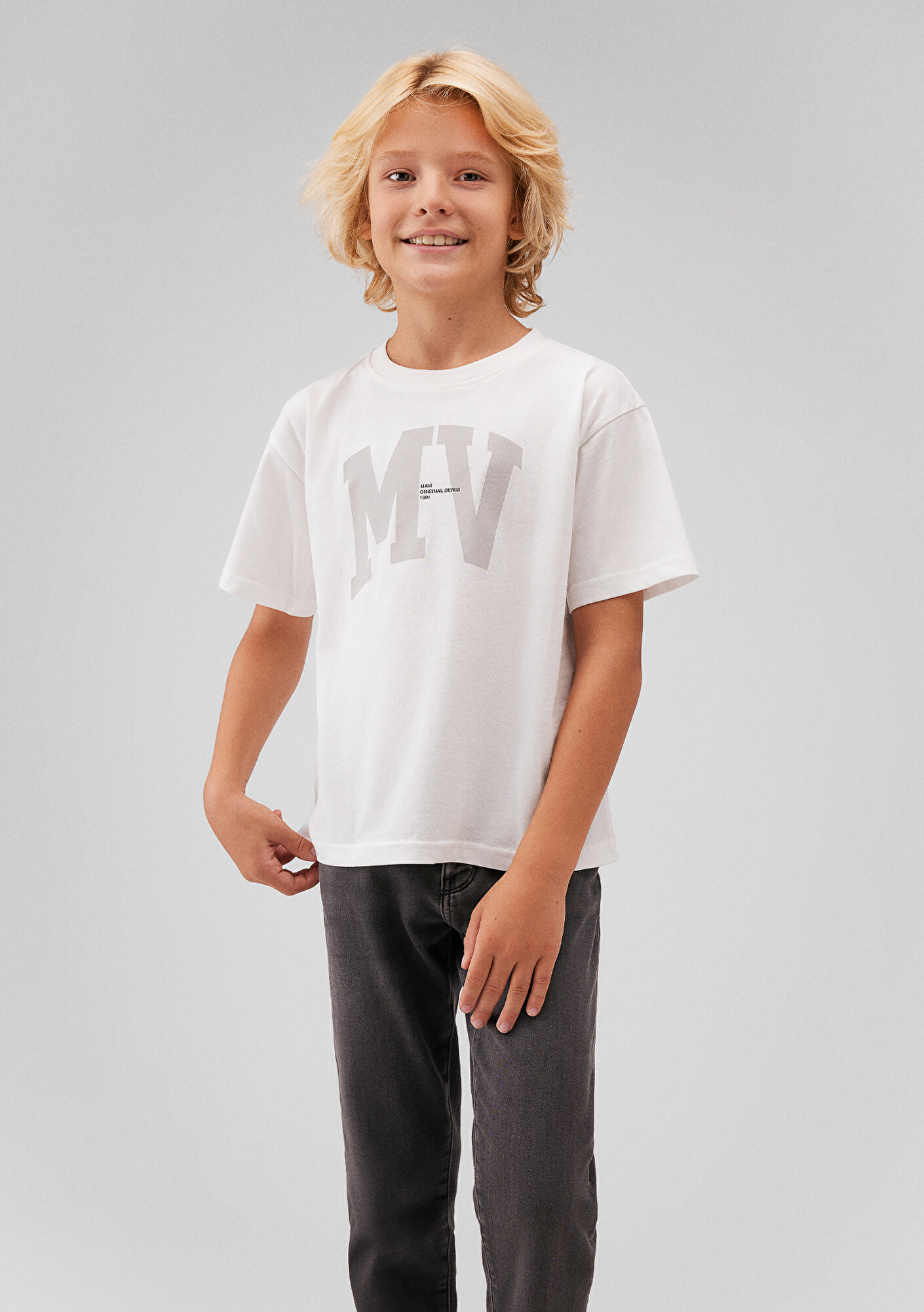Mavi nin çocuk koleksiyonundan MV Logo Baskılı Beyaz Tişört.