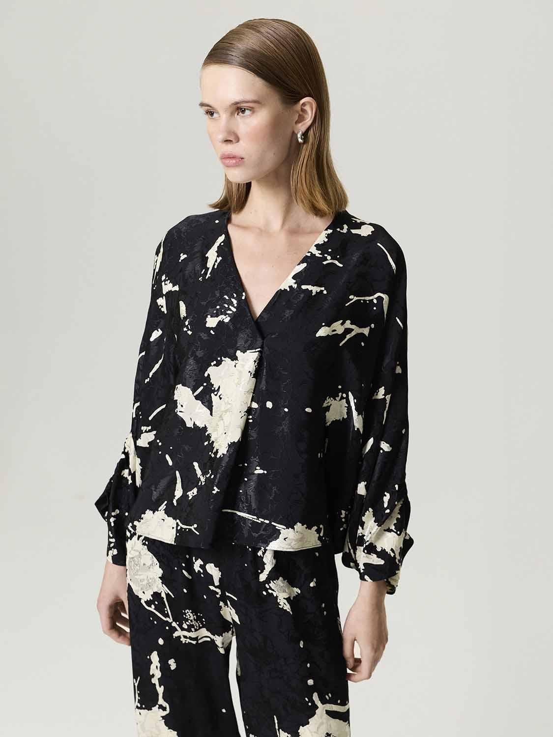 Gardırobunuza zarif bir hareket ve sofistike bir dokunuş katın: Desenli Jakarlı Bluz. Zengin dokuma jakar kumaştan üretilen bu astarsız bluz, ön kısmındaki çapraz kesim ve akıcı sarmal yakasıyla vücutta doğal ve şık bir döküm yaratıyor. Yarasa kollu tasarımı hem hacim hem de dramatik bir hava verirken, büzgülü manşetler özenli ve şık bir bitiriş sunuyor. Sanatsal desenleri sayesinde her bakışta görsel bir ilgi uyandıran bu bluz, iş günlerinden hafta sonu buluşmalarına kadar her kombinle rahatça kullanılabiliyor. Zarif bir etekle veya yüksek belli pantolonlarla kombinleyerek stilinize sofistike bir dokunuş ekleyebilirsiniz. Kalıp: Relaxed Fit Beden Önerisi: Bu model Relaxed Fittir. Rahat bir görünüm için normal bedeninizi, daha dar bir kesim için bir beden küçüğünü tercih edin. Model Ürün Bedeni: S