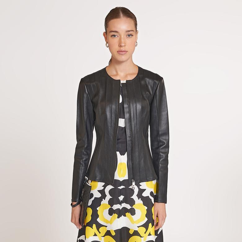 %100 Deri, kadın deri ceket. Yuvarlak yakalı ve önden fermuarlıdır. Özel deri panel ve tül laminasyon çalışması yapılmıştır. Şık aksesuarları mevcuttur. Astarsız olduğu için yaz mevsiminde rahatlıkla giyilebilir. Özel panelleme tekniği ile üretilmiştir. Arka boy ölçüsü 54 cm'dir. Kadın vücut anatomisini vurgulamak için; esneyen tül ile desteğiyle bedene yerleştirilen deriler sayesinde hem rahat hem de fit bir görünüm kazandırılmış, özel deri panel ve tül laminasyon çalışması yapılmıştır. Bu ürün, et endüstrisinin yan ürünü olarak elde edilen ve sürdürülebilir yöntemler ile Leather Working Group Altın sertifikalı Desa tesislerinde tabaklanan deriler kullanılarak üretilmiştir. %100 Koyun derisinden üretilmiştir.-%100 Deri, kadın deri ceket. Yuvarlak yakalı ve önden fermuarlıdır. Özel deri panel ve tül laminasyon çalışması yapılmıştır. Şık aksesuarları mevcuttur. Astarsız olduğu için yaz mevsiminde rahatlıkla giyilebilir. Özel panelleme tekniği ile üretilmiştir. Arka boy ölçüsü 54 cm'dir. Kadın vücut anatomisini vurgulamak için; esneyen tül ile desteğiyle bedene yerleştirilen deriler sayesinde hem rahat hem de fit bir görünüm kazandırılmış, özel deri panel ve tül laminasyon çalışması yapılmıştır. Bu ürün, et endüstrisinin yan ürünü olarak elde edilen ve sürdürülebilir yöntemler ile Leather Working Group Altın sertifikalı Desa tesislerinde tabaklanan deriler kullanılarak üretilmiştir. %100 Koyun derisinden üretilmiştir.