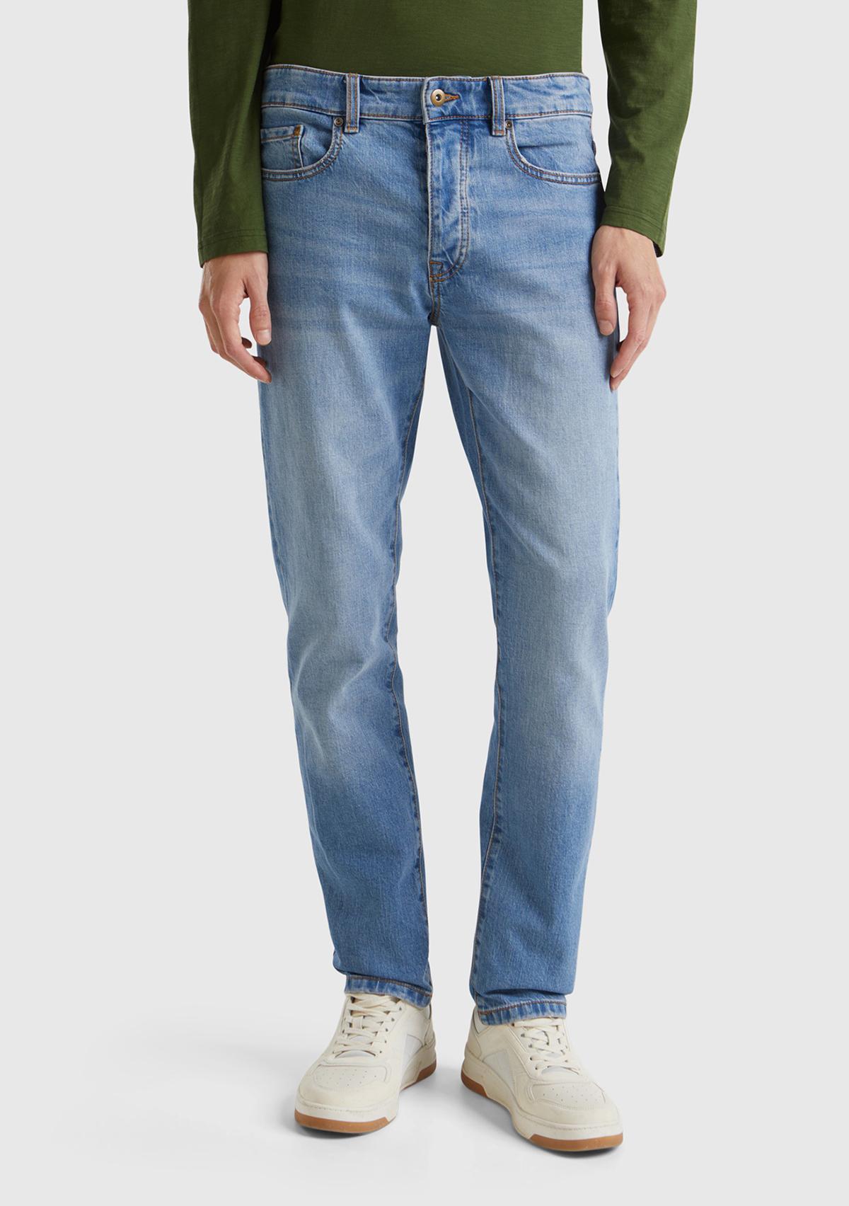 Erkek Açık Mavi Pamuk Karışımlı Arkası Logo Etiketli Cepli Slim Fit Denim Pantolon