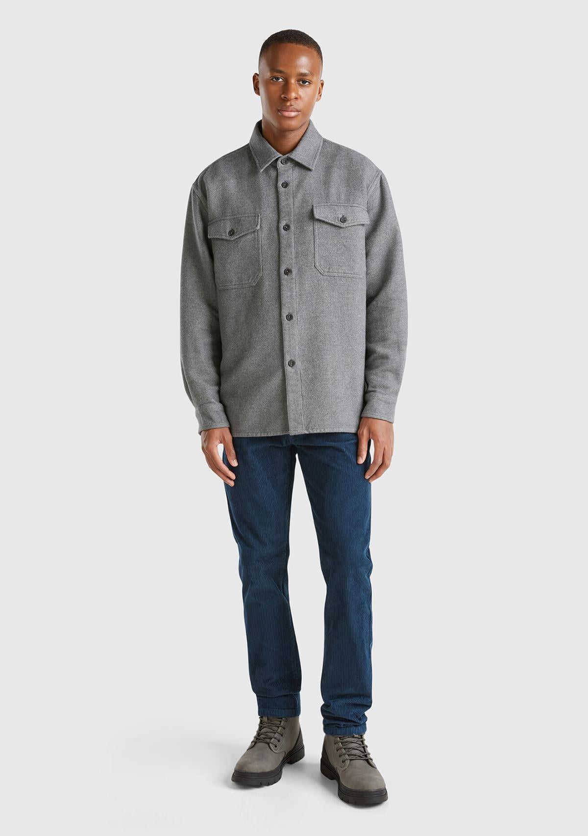 Erkek Antrasit Melanj %100 Pamuk Göğüs Cepli Arkası Logo Baskılı Uzun Kollu Gömlek