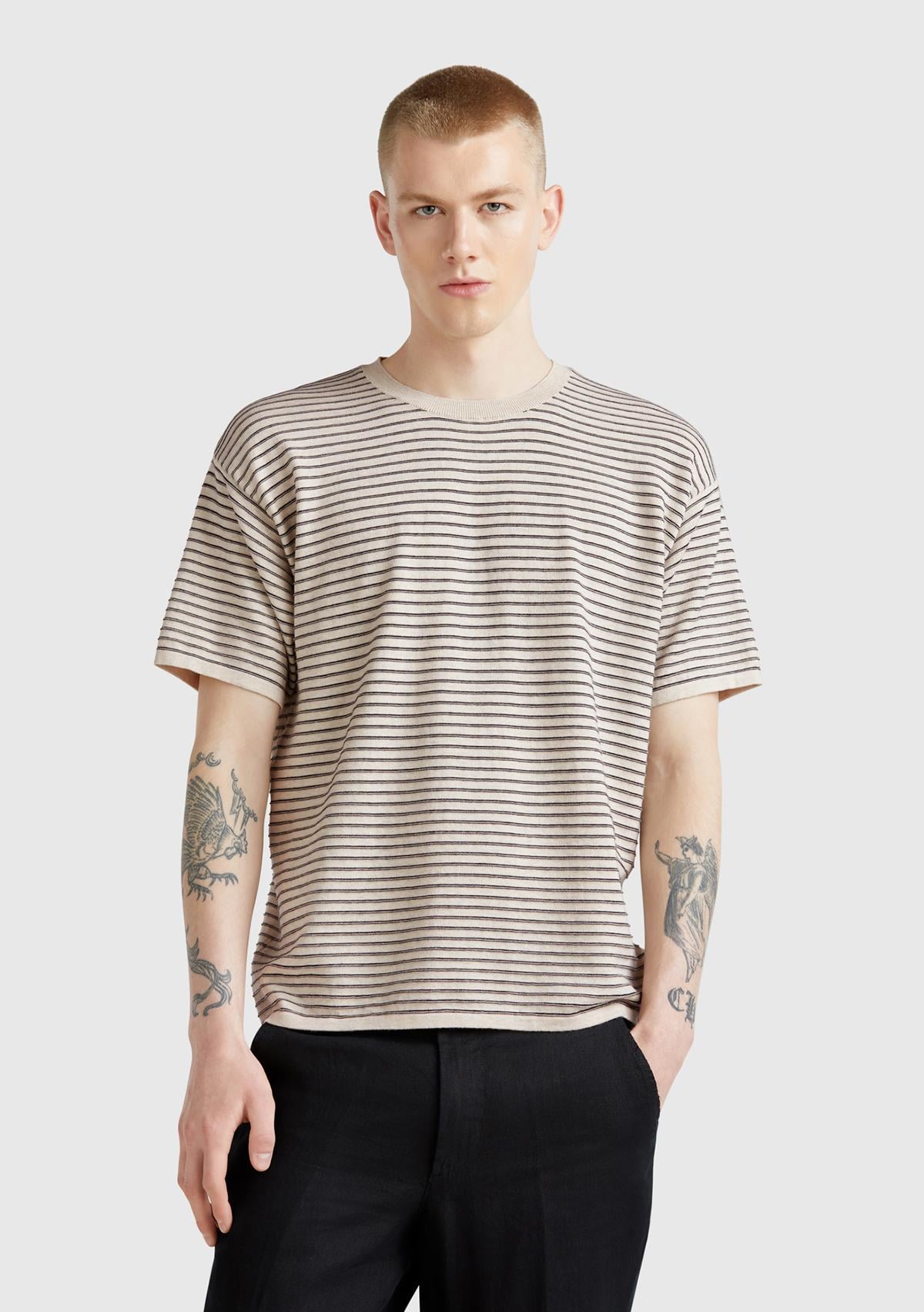 Erkek Bej %100 Koton Kısa Kollu Çizgili Rahat Kesim Kazak
